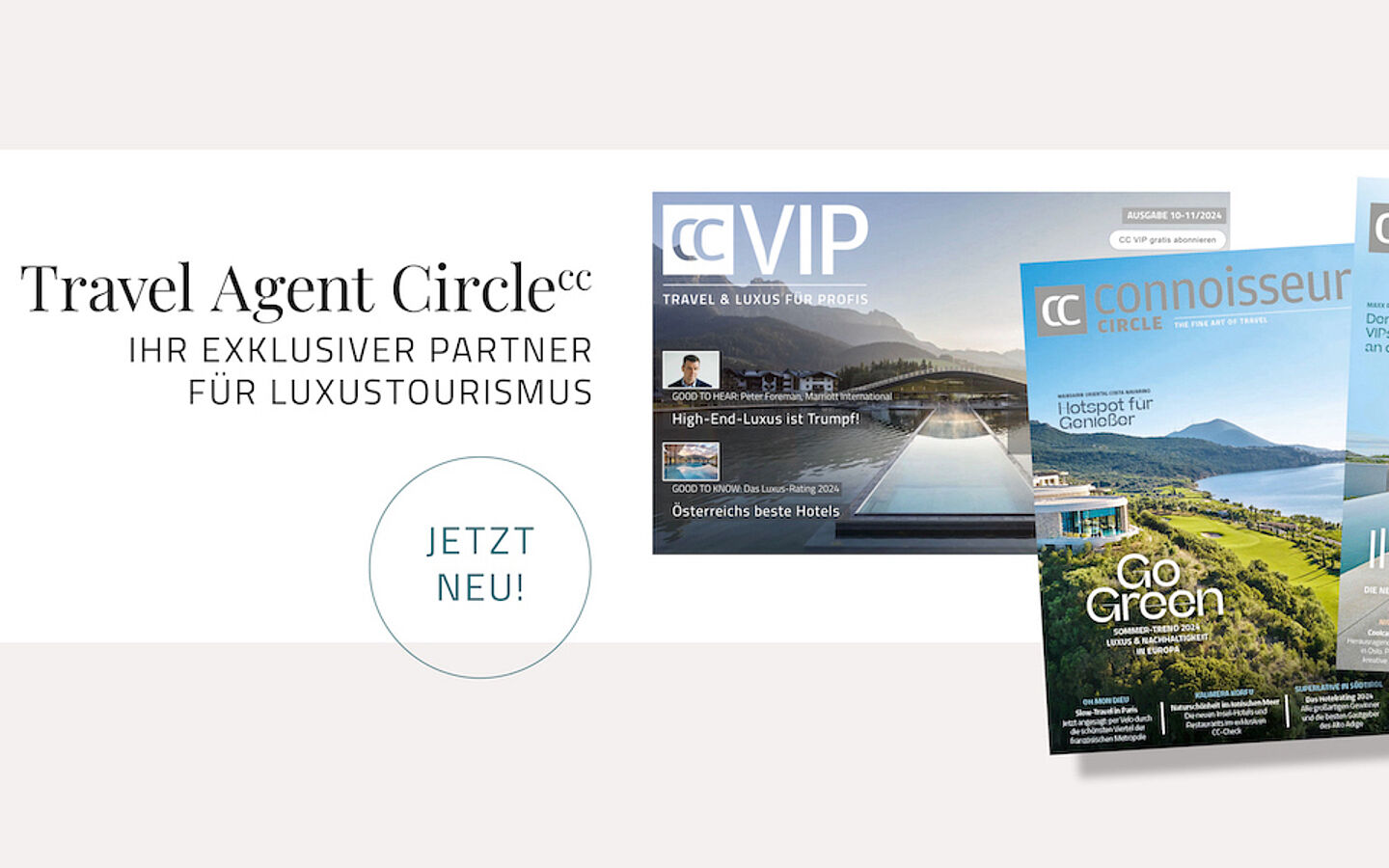 verschiedene Print-Pakete, weiterhin zum Einführungspreis: ab 99 EUR für 4x jährlich je 10 Magazine jeden Monat unser exklusives E-Paper CC VIP mit Travel News und Special-Destination-Content, Restaurant- und Event-Empfehlungen Listung Ihres Reisebüros auf www.ccircle.cc Partnermarketing in der Top-Touristik direkten Kontakt zu CC-Redakteuren – News und Updates aus erster Hand! Vorabinfos über alle Schwerpunkt-Themen der kommenden Ausgabe jeden Sommer das „Connoisseur Private Moments“-Magazin für Sie kostenlos die Möglichkeit auf individuelles Cover Branding – sprechen Sie uns an!