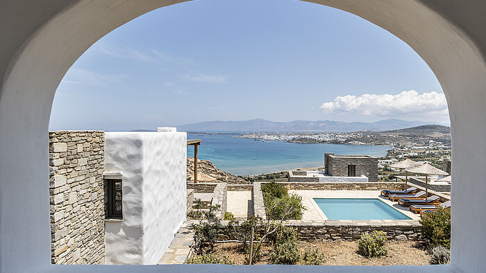 Er ist einfach immer da, dieser unendliche Ausblick auf die Insellandschaft und die Bucht von Naoussa. Vom Bett aus durchs Schlafzimmerfenster. Vom privaten Pool aus über die Terrasse. Und vom Esstisch aus bei sämtlichen Mahlzeiten. Aber es ist nicht nur das Panorama, das die insgesamt 24 Acron Villas zu einem herrlich entspannten Ort inmitten der schroffen Kykladen-Landschaft macht. Es ist auch das ebenso edle wie minimalistische Ambiente mit viel Naturstein, Holz und weiß getünchten Wänden. Die Acron Villas bestehen aus ein- oder zweistöckigen, mit zwei bis fünf Schlafzimmern ausgestatteten Kuben, die alles bieten, was es für einen angenehmen Aufenthalt braucht – von der Klimaanlage und dem großem LED-TV über den mit Wasserflaschen gefüllten Kühlschrank bis hin zur voll eingerichteten Küche. Und wenn es doch einmal an etwas fehlt, ist das freundliche, hilfsbereite Personal schnell zur Stelle. Joghurt mit Honig und Walnüssen, Brot, Schafskäse und Tomaten, frisch gepresster Orangensaft, ein griechischer Kaffee, mehr braucht es nicht für das kleine, große Urlaubsglück am Morgen. Wer nicht selber einkaufen möchte, nimmt den Frühstücks-Service in Anspruch. Danach geht es auf die Liege am Pool – die Polster in den griechischen Nationalfarben blau, für den Himmel und das Meer, und weiß, für die Reinheit des griechischen Freiheitskampfes. Oder sollen wir stattdessen lieber an den Strand? Der von Kolimbithres mit seinen besonderen Granitformationen ist nur ein paar Fahrminuten entfernt. Ebenso der bekannte Monastiri Beach mit seinem glasklaren Wasser. In jedem Fall lohnt sich bei einem Aufenthalt in den Acron Villas ein Mietwagen. Auch um abends nach Naoussa zu fahren und in einem der guten Restaurants am malerischen Fischerhafen zu Abend zu essen.