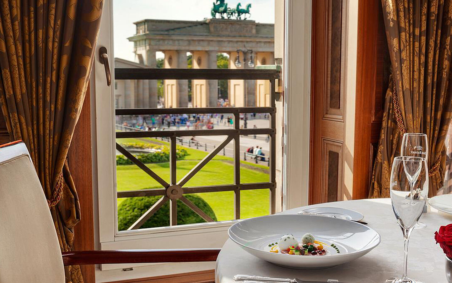 Im Sommer genießt man auf der großzügigen Terrasse am Platz vor dem Brandenburgertor ein täglich wechselndes Daily Dish, abends ein Essen in ungezwungener Atmosphäre oder ein romantisches Dinner zu zweitin der Brasserie Quarré. Absolutes Highlight sind allerdings die Köstlichkeiten, die im Lorenz Adlon Esszimmer serviert werden. Hier genießt man klassisch französischen Gourmetkreationen. In stilvoller Wohlfühlatmosphäre verkostet man bis zu 8 Gängen von aufeinander abgestimmten Delikatessen. Alle Gerichte und korrespondierenden Weine von über 1.300 der erlesensten Rebengewächse spiegeln die durchdachte Kombination handverlesener Ingredienzien wider, deren harmonisches Zusammenspiel stets neu überrascht. In der eleganten Elephant Bar klingt der gelungene Abend aus.