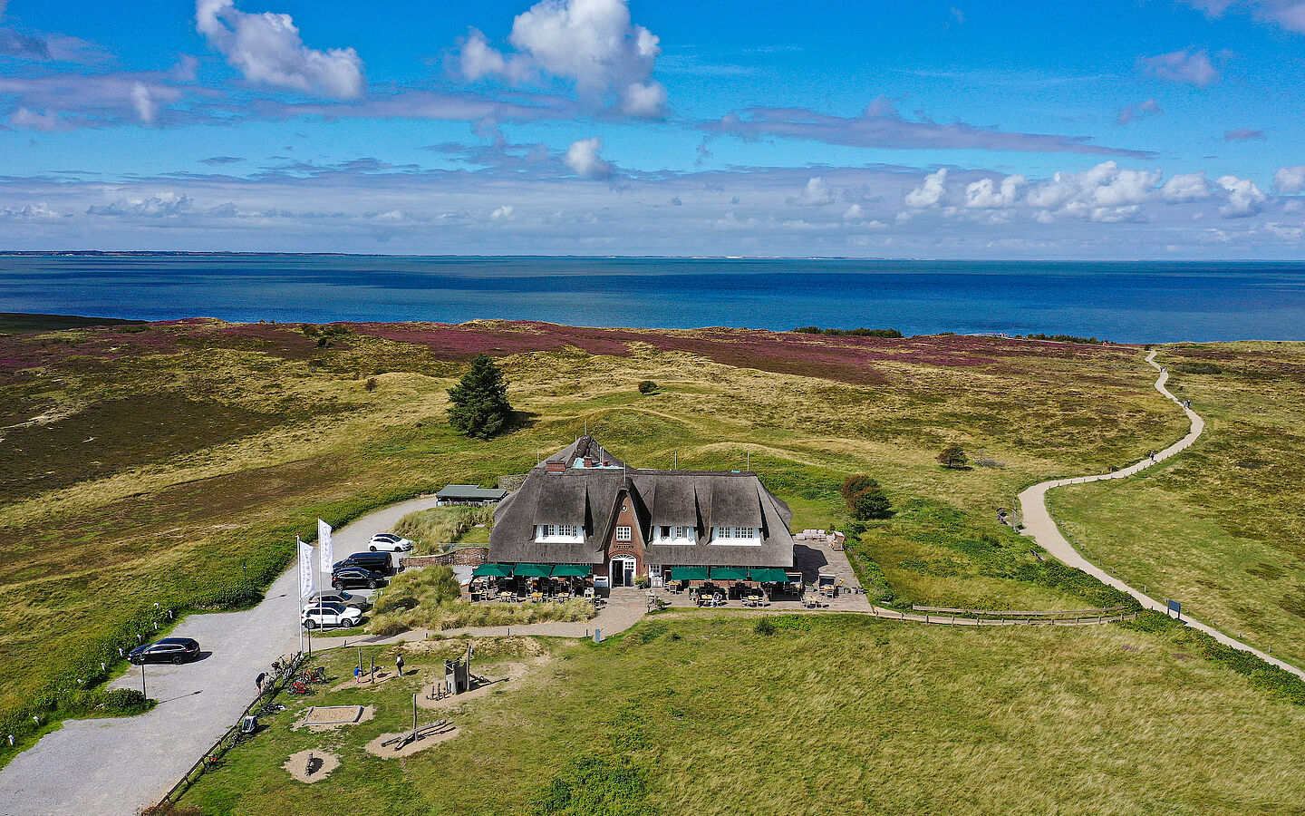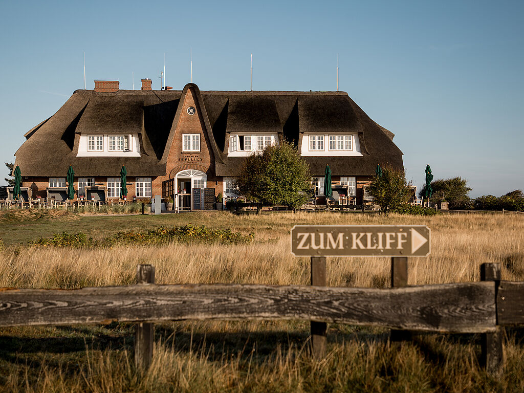 Über den sanften grünen Hügeln thront das Landhaus Severin*s Morsum Kliff mit direktem Blick auf das Wattenmeer. Architektonisch präsentiert sich das Gebäude im inseltypischen Stil. Das großzügige Reetdach schützt das Hoteljuwel vor den strengen Winden. Bei der Ausstattung wurde viel Wert auf Qualität gelegt. Die Möbel, Farben und Stoffe der Zimmer und Suiten sorgen für ein Wohlfühlambiente mit weitem Blick über die reizvolle Sylter Landschaft.
