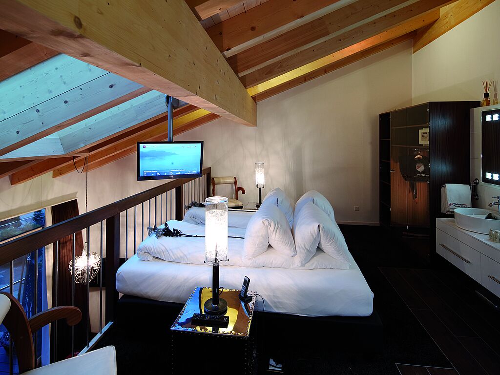 Die 23 komfortablen Zimmer und Suiten tragen die unverkennbare Handschrift von Heinz Julen und sind von einer exklusiven Ausstattung mit futuristischem Einschlag bestimmt – Leuchter, Designerstühle und Tische begeistern mit Ästhetik in Vollendung. Die Suiten sind mit separaten Wohn- und Schlafräumen ausgestattet und eignen sich so ideal für Familienurlaube. Als Extra-Bonus verfügt das Wellness & Spa Pirmin Zurbriggen über spezielle Allergikerzimmer. Großteils mit Balkonen ausgestattet, bieten alle Räumlichkeiten einen zauberhaften Ausblick auf das Alpenpanorama – im Sommer auf blühenden Almwiesen, im Winter auf ein schneebedecktes Wunderland.