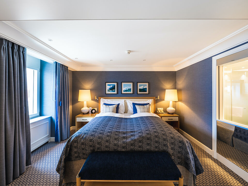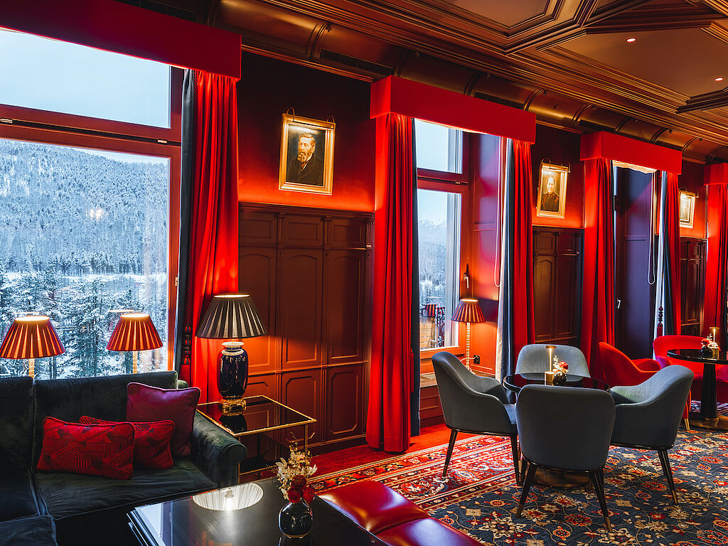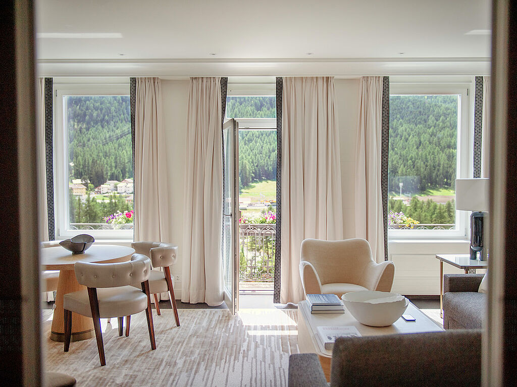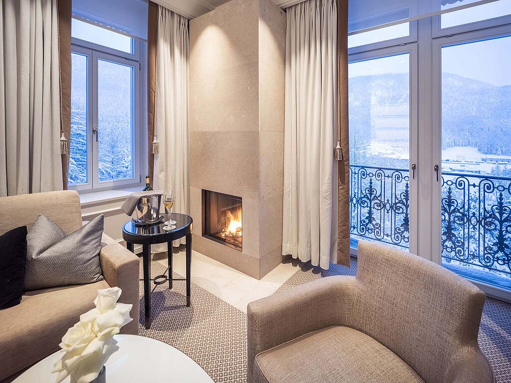 Ein Mix aus Grand-Hotel-Atmosphäre und modernem Komfort mit viel Stil, Klasse und Eleganz bestimmt auch die Gäste-Zimmer des Grand Hotel Kronenhof Pontresina. Das perfekte romantische Refugium unter den 112 Zimmern und Suiten findet das frisch verheiratete Paar in der Valentine Suite: In dieser stilvollen, 56 m² großen Maisonette umschmeichelt Sie ein separater, von Engadiner Bergfichte bestimmter Wohn- und Schlafraum sowie ein offen gestaltetes Badezimmer in grauem Marmor - die heimelige Atmosphäre verleiht ein zusätzliches Gefühl von Geborgenheit. Der Kuschelfaktor ist von Anfang an hoch und wird durch die gemütlich-entspannte Atmosphäre und bezaubernde Highlights mit Herz – wie auf dem Rand der Doppelbadewanne verteilten Rosenblättern – noch zusätzlich verstärkt.