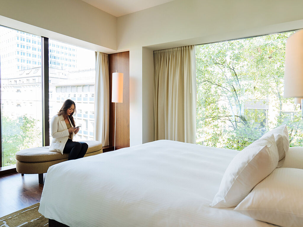 Das als Luxushotel erbaute Park Hyatt Zürich schafft es, moderne Annehmlichkeiten mit natürlichen Elementen und zeitgerechtem Design zu verbinden. Innerhalb der eleganten, verglasten Fassade des 5-Sterne-Hotels erwarten Sie avantgardistische Architektur und moderne Kunst – genießen Sie die angenehme Boutiquehotel-Atmosphäre, welche mit Kunstwerken wie Ingo Maurer´s Kronleuchter Porca Miseria! begeistert. Große Marmor-Badezimmer mit Badewanne und separater Regendusche, hochwertige Badeartikel und 24-Stunden Roomservice sind nur einige der Highlights der 138 großzügigen Zimmer und Suiten des Zürcher Stadthotels. Zudem wurden alle Zimmer kürzlich frisch renoviert und erstrahlen in neuem Glanz. Wer sein Haupt dann zur Ruhe bettet, freut sich über die Anti-Allergen-Kopfkissen oder über das hoteleigene Programm YogaAway, das Stressgeplante mit extra angefertigter Yogamatte und Entspannungs-DVDs in den wohlverdienten Ruhezustand versetzt.