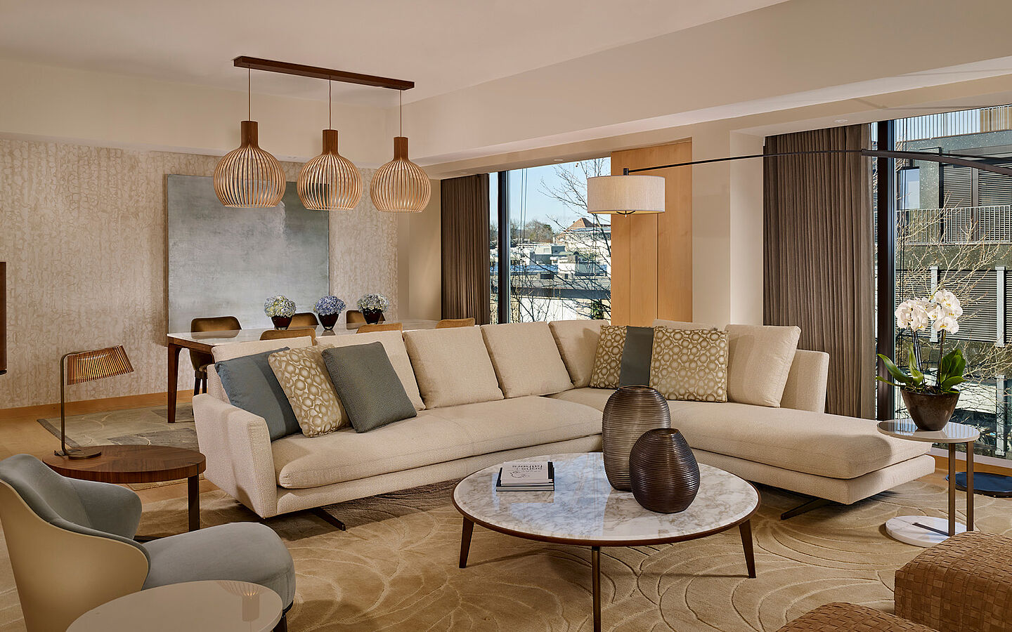 Ein Highlight des Hauses ist die Präsidenten Suite. Die 160 m², ausgestattet mit vielen raffinierten Details aus Holz, Bronze und Glas, sind nun die größte, luxuriöseste und komfortabelste Suite der Stadt. Das Wohnzimmer beeindruckt mit eleganter Sofafläche und offenem Kamin, der nebenan liegende Esszimmerbereich mit seiner voll ausgestatteten Bar und der Bürobereich mit bodentiefen Fenstern. Vom Besprechungstisch ist ein atemberaubender Blick aus dem 6. Stock auf den quirligen Finanzdistrikt Zürichs erlaubt. Das in den Farben hellbeige designte Schlafzimmer wiederum ist mit einem King Size Bett und einem begehbaren Kleiderschrank ausgestattet. Ein weiteres Highlight ist das große Badezimmer aus Marmor, in dem sich eine freistehende, extra tiefe Badewanne und eine großzügige Regendusche mit Dampfbadeigenschaften befinden. Für noch mehr Platz lässt sich die Suite durch eine Verbindungstür in ein Zwei-Schlafzimmer-Appartement erweitern, was absolute Privatsphäre garantiert.