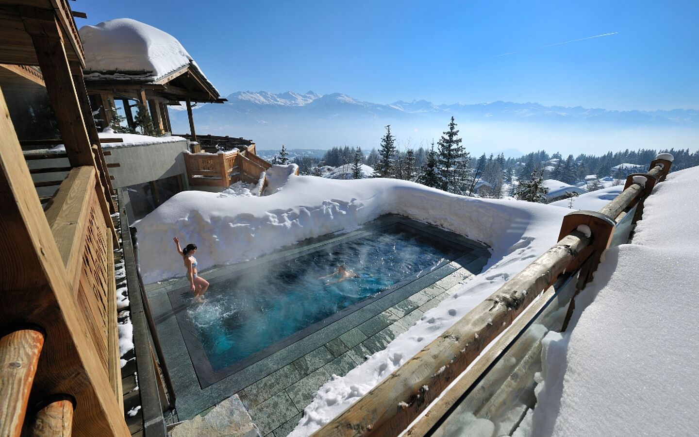 Umgeben von Stein, Holz, Wasser und Stille, bietet das elegante und modern konzipierte CINQ MONDES Spa ein persönliches und einzigartiges Erlebnis in einer authentischen Umgebung, in der jeder Moment zu einer Reise zum Mittelpunkt des Wohlfühlens wird – gekrönt von einer atemberaubenden Panoramasicht auf die Berge des Valais! Ein besonderes Highlight ist der beheizte Außenpool: Hier schwimmt man buchstäblich zwischen Himmel und Bergen – ein wahrlich einzigartiges Erlebnis! Auch der Innenpool und der Jacuzzi sorgen für erquickende Erfrischung, für gediegenes Schwitzen empfehlen sich das Dampfbad, der orientalische Hamam und die Sauna. Sportbegeisterte kommen im voll ausgestatteten Fitnessstudio auf ihre Kosten – hier warten hochmoderne Trainingsgeräte darauf, die Muskeln zu stählen.