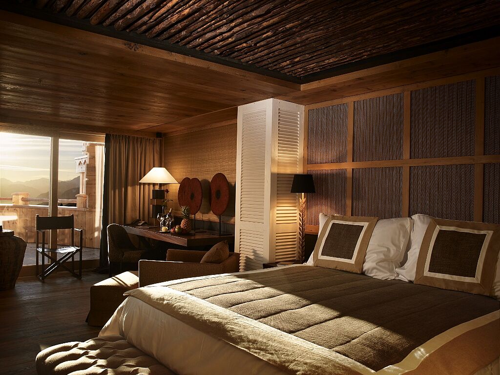Die individuell eingerichteten Zimmer und Suiten sind inspiriert von fremden Ländern, Regionen und Kulturen und lassen den Gast für ein paar Tage in eine exotische Welt eintauchen. Möchten Sie afrikanisches Wüstenflair genießen? Dann buchen Sie das Deluxe Zimmer Kilimandjaro – hier wird die Decke über dem Bett von Wüsten-Zweigen geziert, traditionelle sandfarbene Samtdecken aus Kasai schmücken die Wände und afrikanischer Federschmuck dient als attraktives Accessoire. Dass sich hinter den großen Fenstern zur Terrasse ein Winterwunderland auftut, erscheint fast surreal. Modernster Flatscreen über dem Whirlpool im Badezimmer, Springbrunnen im Wohnzimmer und knisternder Kamin vor dem King-Size-Bett im Schlafzimmer – in den edlen Räumen des LeCrans Hotel & Spa gibt es keine Wünsche, die nicht erfüllt werden.