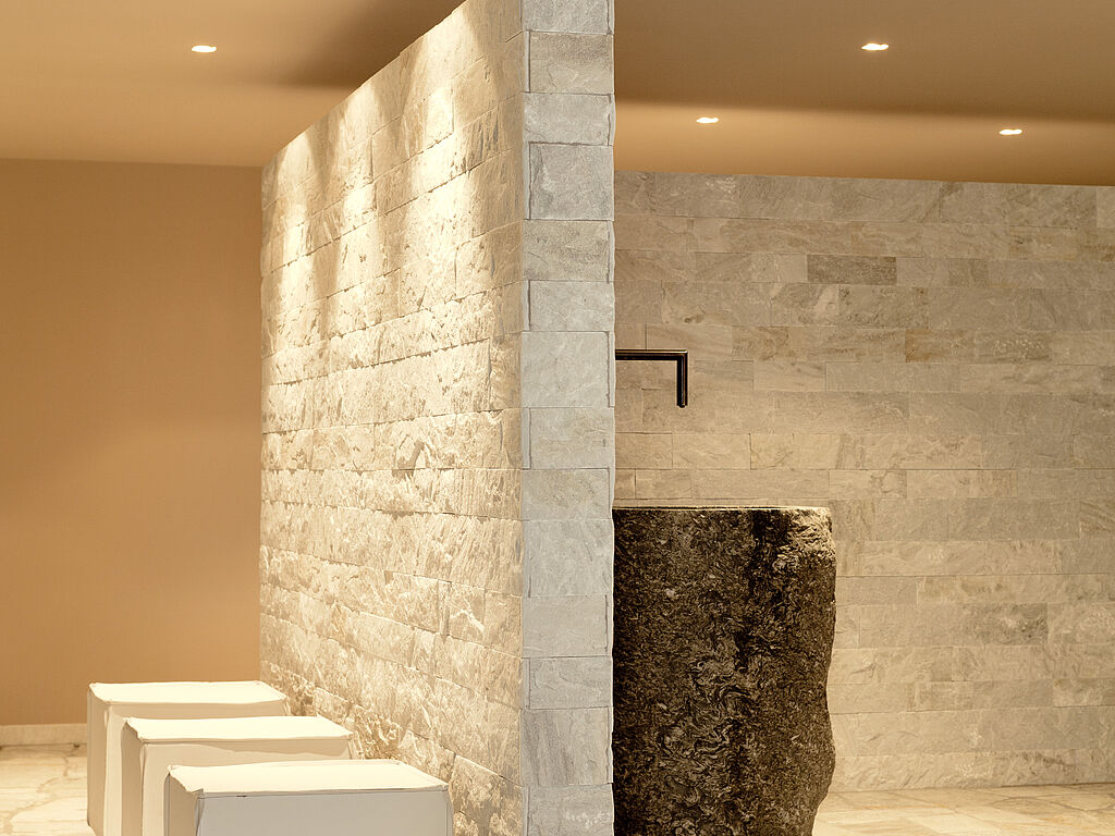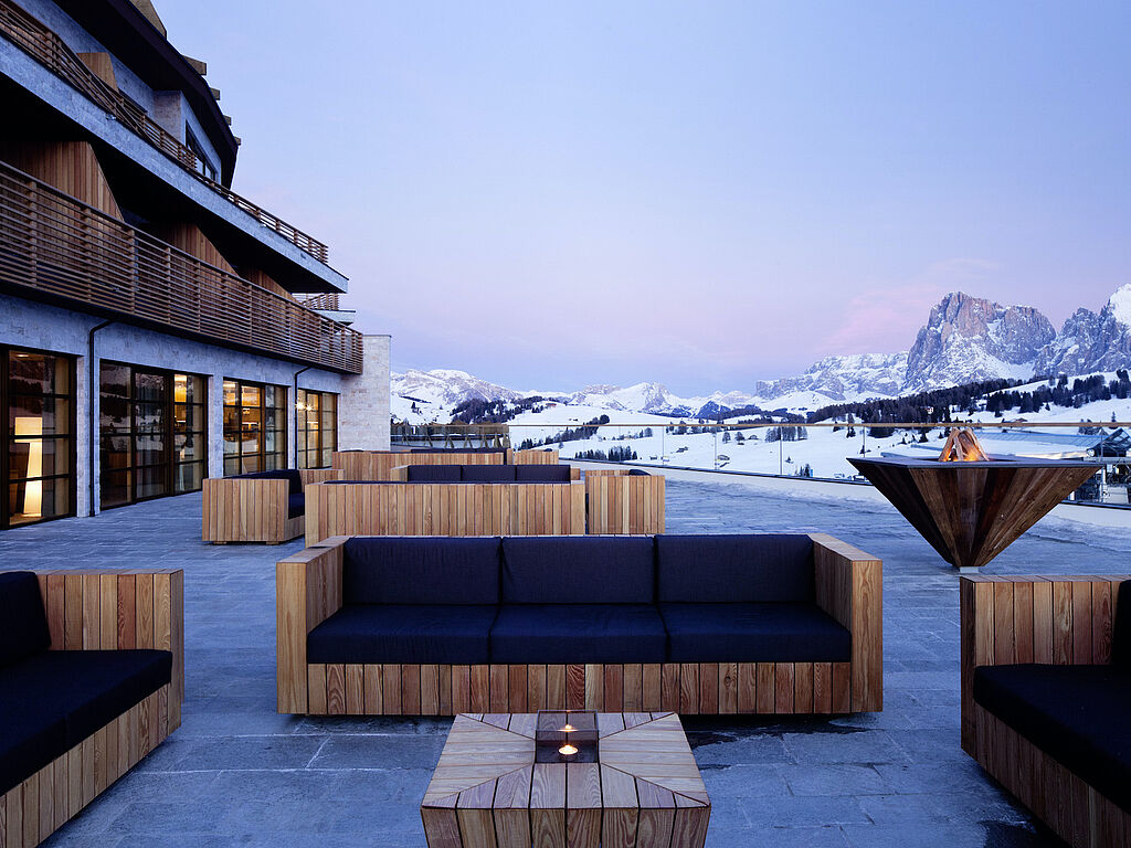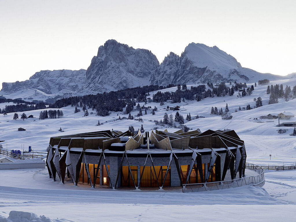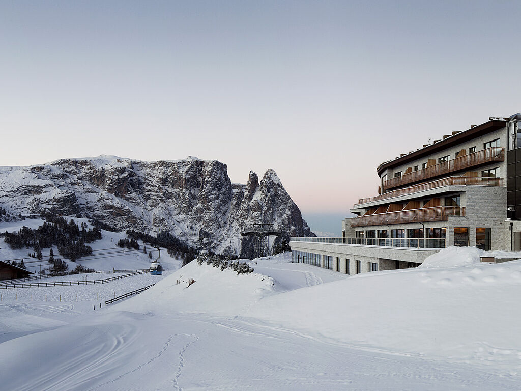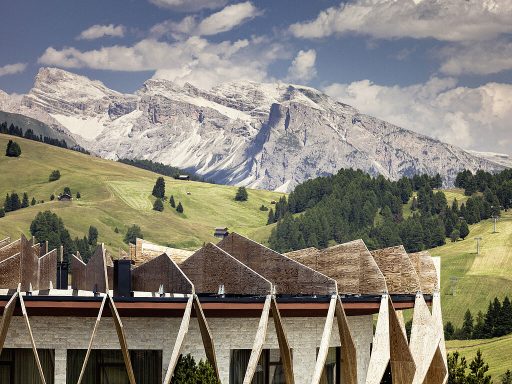 Durch die bemerkenswerte Quarzit-Naturstein-Ummantelung und das Holz scheint das Gebäude mit der umliegenden Bergwelt regelrecht zu verschmelzen. Sämtliche Zimmer und Suiten sowie die Aufenthaltsbereiche und Speisesäle sind nach Süden gerichtet. Die gewaltigen Fensterfronten ermöglichen einen optimalen Ausblick auf die wunderschöne Bergwelt der Dolomiten.