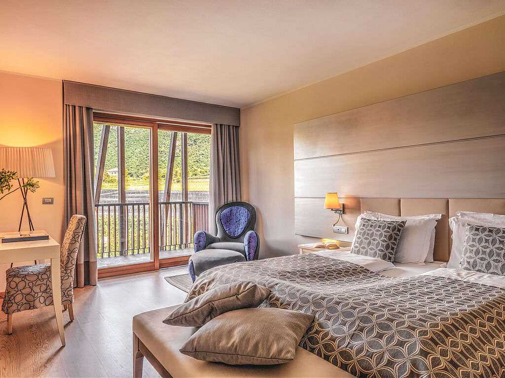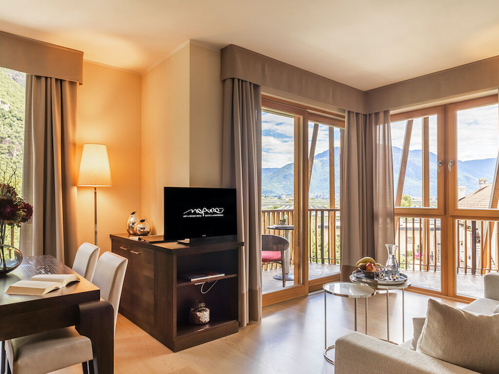 Die Terrasse ist das Herz des Hotels, hier genießt von morgens bis abends eine angenehme Zeit. Der Tag startet hier bereits hervorragend mit einem ausgedehnten Frühstück. Tagsüber können sich die Gäste im Schwimmbadbereich oder im Wellnessbereich entspannen und dabei die Köstlichkeiten des SkyBistro versuchen. Übrigens steht auch eine große Auswahl für Veganer und Vegetarier zur Verfügung. Am Abend kann man einzigartige Aperitifs und Cocktails genießen, immer den fantastischen Blick auf das Etschtal vor Augen. Es werden zum Beispiel auch Cocktail-class und Live Bands organisiert.