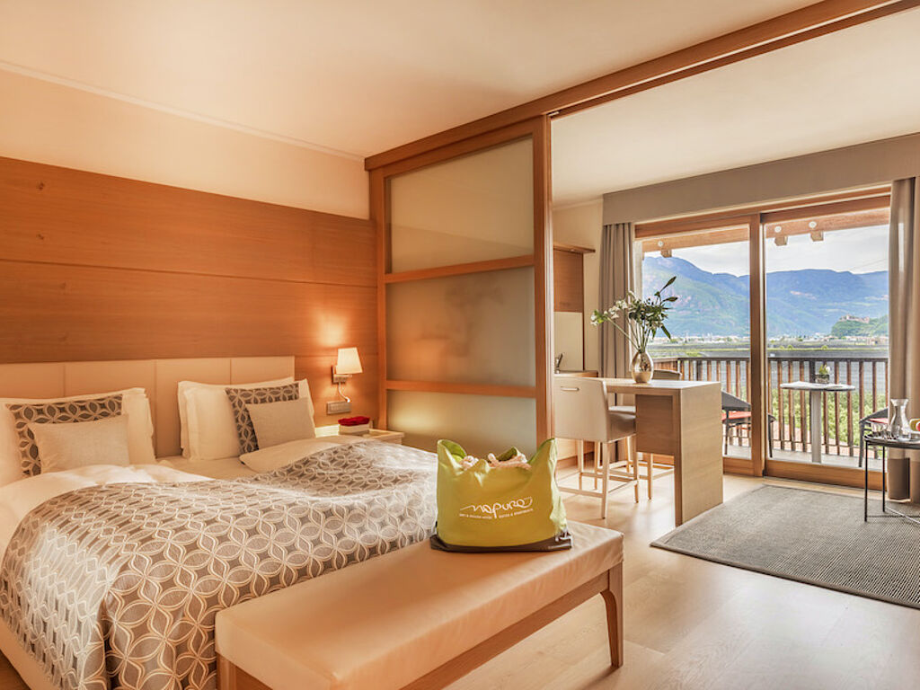 Im obersten Stockwerk des Napura wartet der Sky Wellnessbereich mit türkischem Dampfbad, finnischer Sauna, Erlebnisduschen mit Farbtherapie, Ruheoase, Tee-Ecke und herrlichem Ausblick auf die Dolomiten. Draußen chillt man im Außenpool, den Whirlpools und auf der Panoramaterrasse mit Liegen und Pavillons.