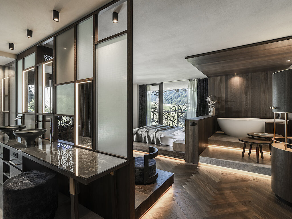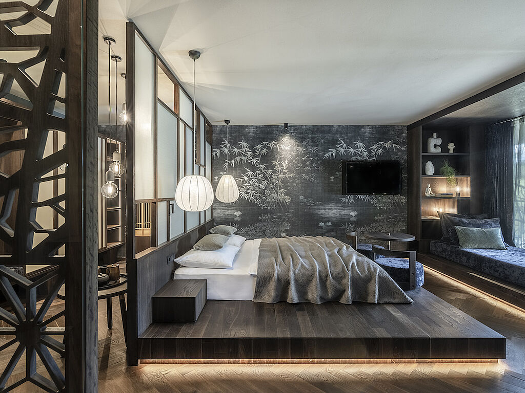 Alle 48 Studios und Suiten bestechen durch die Einbindung formgebender, fernöstlicher Elemente, deren zeitgenössisches Finish sowie die Kombination mit Südtiroler Materialien wie Zirbenholz und Räuchereiche. Filigrane Zeichnungen asiatischer Pflanzen, zarte Leuchten und Reispapier sorgen für weitere asiatische Strukturen.