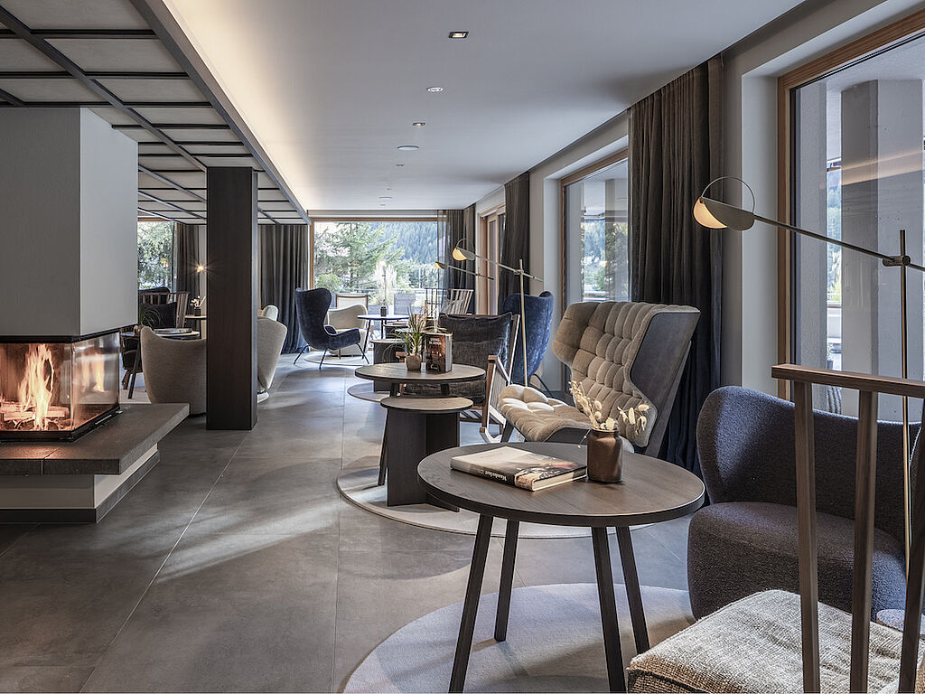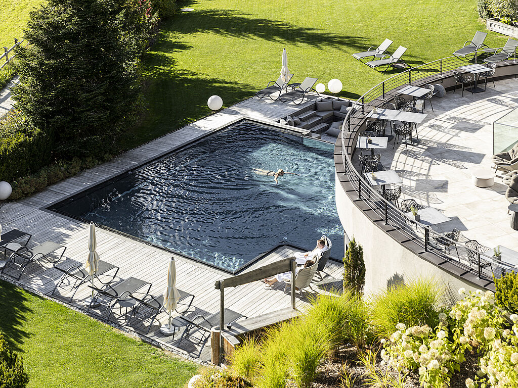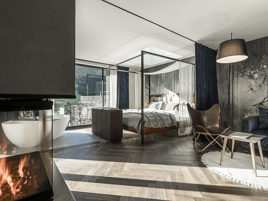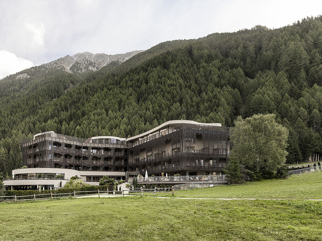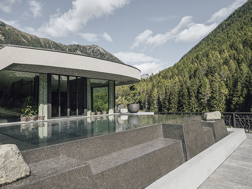 Auf der Dachterrasse findet man den 40 Grad warmen Onsen Infinity-Pool. Im heißen Quellwasser der Valser Berge ‒ angereichert mit Mineralien aus dem Vulkangestein des Schlerngebiets, dem Seiser Basalt, genießt man beinahe schwerelos die tief bewaldeten Hänge des Valser Hochmoors. Während der Körper Wärme, Revitalisierung und Harmonie erfährt, werden alle Sinne angeregt: Plätscherndes Wasser rinnt über den Lavastein, Feuer knistert, die frische Bergluft kühlt die feuchte Haut.