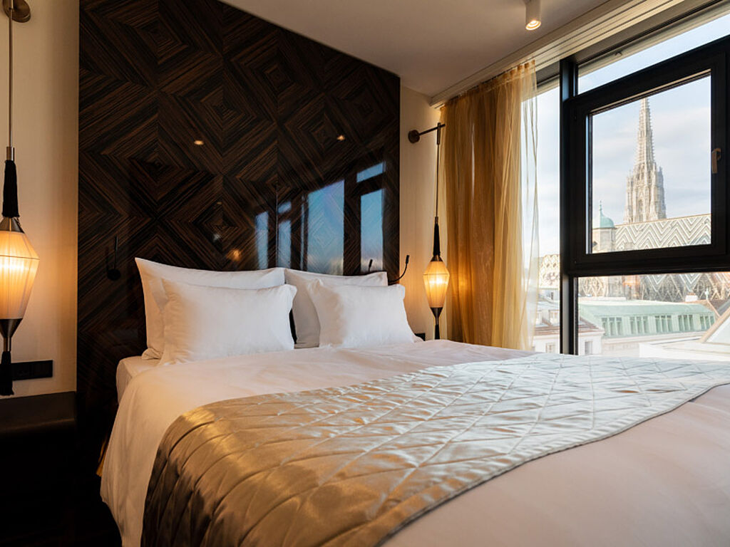 Als sichtbare Hommage an die Wiener Werkstätte mit Künstlern wie eben etwa Koloman Moser (Mitbegründer der Wiener Secession), stellen sich die insgesamt 64 Räumlichkeiten dar. Nur wenige Schritte entfernt, liegt das Schwesterhotel LAMÉE mit der einzigartigen LAMÉE Rooftop Bar sowie der frisch eröffneten LAMÉE MINIBAR. Im Haus LAMÉE wird das Motto „Hollywood-meets-Vienna-Charme“ gelebt und das Interieur spiegelt den stilistischen Glamour der 1930er-Jahre wider: Honigfarbener schimmernder Wände, hochglänzenden Makassar-Schmetterling-Holzverkleidungen und wertvollen Marmorbädern. Hier können Gäste auch in u.a. zehn spektakulären Domblick-Suiten nächtigen. Sowohl das TOPAZZ als auch das LAMÉE verfügen jeweils über 32 Zimmer und Suiten und wuchsen 2019 zusammen. Seither gelten sie auch als ein Hotel, aufgeteilt auf zwei Häuser. Es sind zwei wunderbare Teile eines Kunstwerks, nur einen Herzschlag voneinander entfernt.