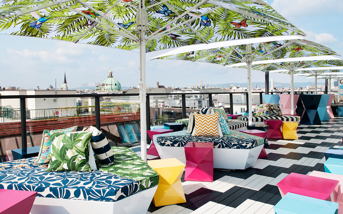 Filmreif ist auch die LAMÉE ROOFTOP Bar im 9. Stock mit ihrem tropisch-anmutenden Setting und einem fantastischen Ausblick direkt auf den nahegelegenen Stephansdom und die Wiener Innenstadt. Erfrischende Drinks (Tipp: Ein Gläschen Wein aus dem hauseigenen Bioweingut LENIKUS Wien) und feine Snacks machen den Tag hier zur Nacht.
