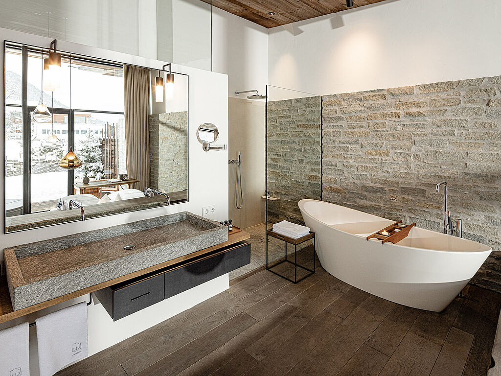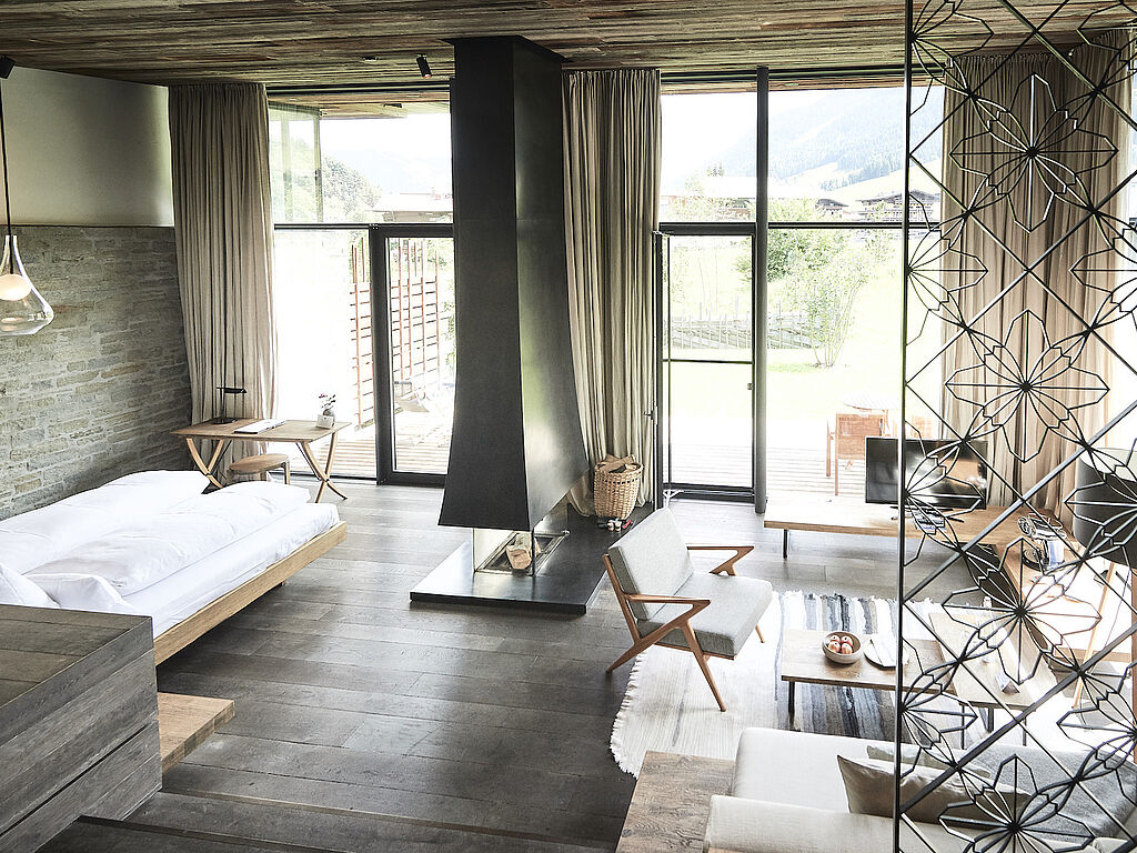 Das Designhotel Wiesergut offeriert 24 Suiten in drei Kategorien, jede mit eigenem Balkon oder Terrasse. Die 17 Gutshofsuiten im Haupthaus mit Boutique Hotel-Charakter glänzen durch ihre Ausrichtung mit wahrlich beeindruckenden Ausblicken auf das Salzburger Alpenpanorama. Auch die Einrichtung bezieht sich auf die umgebende Natur, abzulesen zum Beispiel an der mit archaischen Holz versehenen Zimmerdecken oder in den wuchtigen Steinmauern. Diesem traditionellen Ausdruck wird das Hier und Jetzt in Form von Stahl und Glas entgegengesetzt und ergibt derart eine Synergie aus Tradition und Moderne. Noch einen Schritt weiter gehen die vier GartenSuiten und die drei mit Saunahäuschen inkludierten HideawaySuiten, wo das Innere mit dem Äußeren nahezu zu verschmelzen scheint.