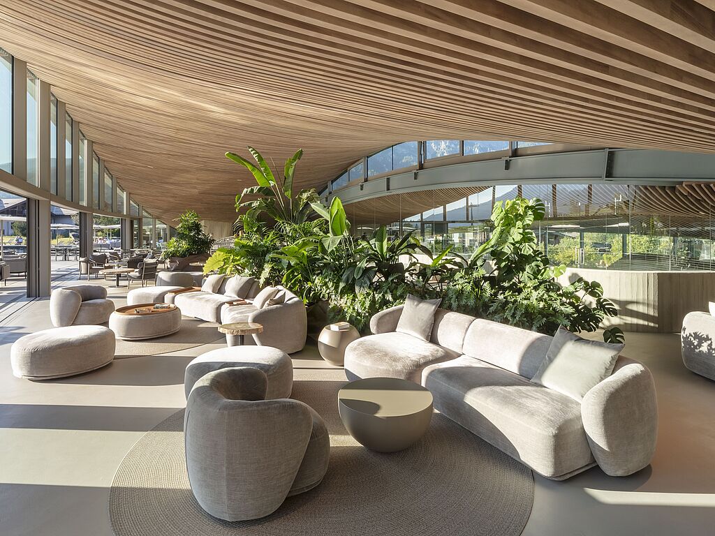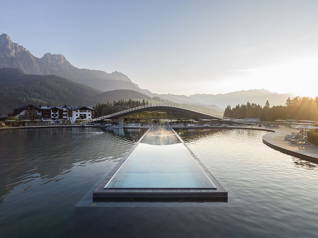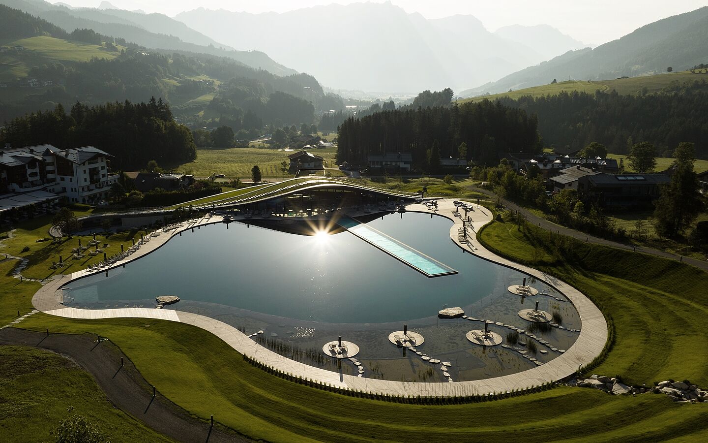 ATMOSPHERE by Krallerhof nennt sich die ikonische Spalandschaft, designt vom Hamburger Star-Architekten Hadi Teherani. Der 5.500 m2 große Natur-Badesee bietet für Gäste nicht nur ein Entspannungshighlight, sondern er tut auch etwas für die Umwelt. Auf einem Drittel der Wasserfläche ist ein Pflanzengürtel angelegt und der Badesee wurde nur ein einziges Mal mit der eigenen Hausquelle befüllt, der natürliche Zyklus von Verdunstung und Niederschlag reguliert den Wasserstand von selbst. Nahtlos in den See integriert sich ein 50 Meter langer Infinity-Pool. Weitere Highlights sind ein Sonnendeck, mehrere Saunen, eine Blaue Grotte, Ruheräume und ein Whirlpool im See.