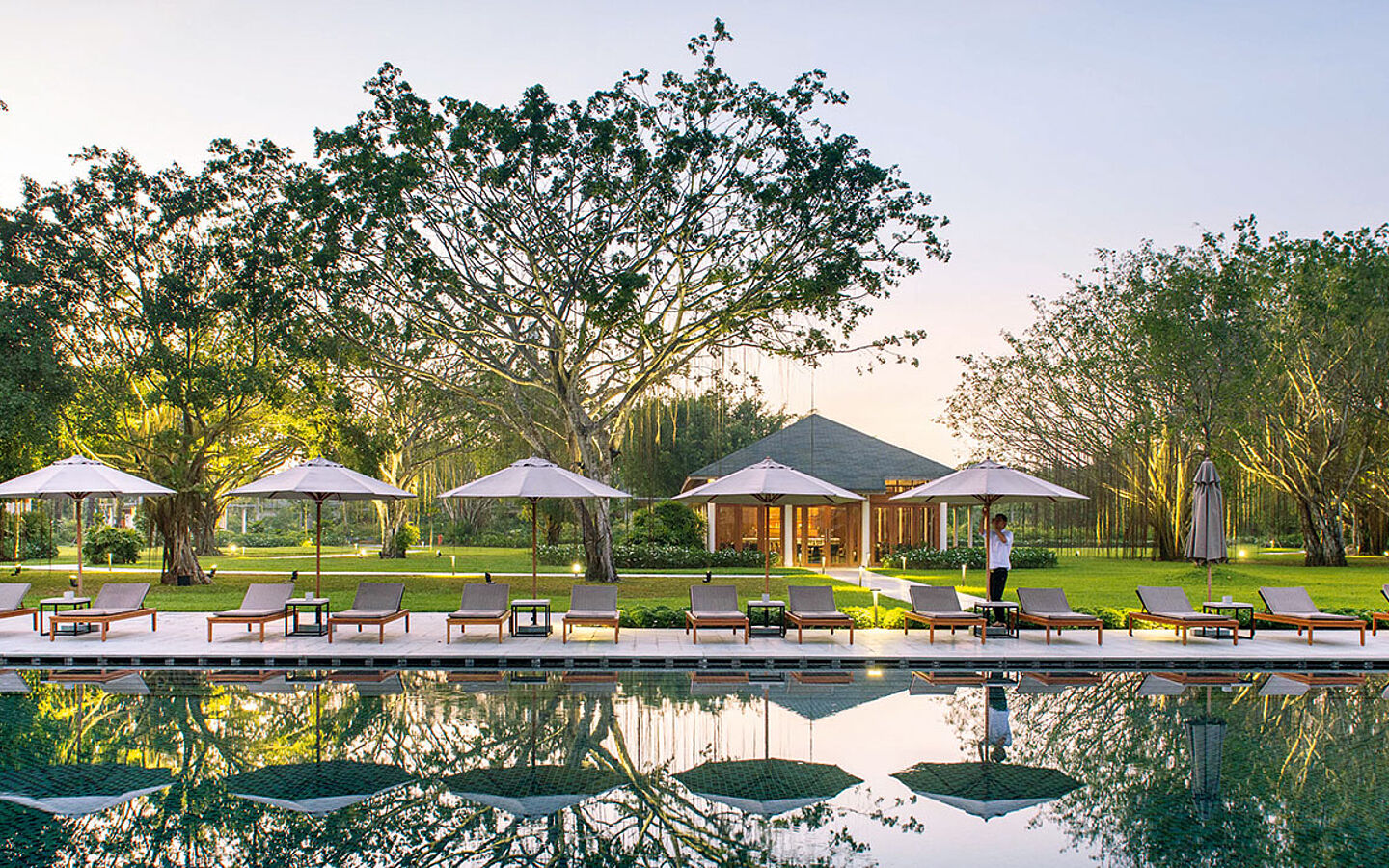 Wer in Amanresorts oder GHM-Hotels genächtigt hat, deren Ursprung ebenfalls auf Adrian Zecha zurückgeht, erkennt den puristischen Stil wieder. Vorbilder sind traditionelle, vietnamesische Dorfhäuser mit einer an drei Seiten offenen Veranda. Elegante Holzmöbel setzen Akzente im luftig-hellen Ambiente. Glastüren zur Terrasse und zum Seitenfenster wirken wie ein Rahmen ums dichte Grün. Jedes Zimmer und jede Suite besteht aus einem freistehenden Pavillon. Bäume, Buschwerk und Rasen trennen sie voneinander ab. Faszinierend ist der große Teich im Herzen der Anlage, auf dem rosa Lotus sprießt.