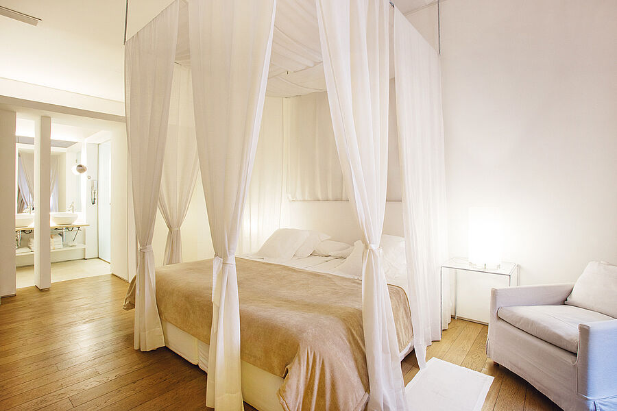 Alle Zimmer sind ganz in Weiß gehalten. Jedes ist individuell eingerichtet. Modernes Design wird mit zeitgenössischer Kunst und landestypischen Elementen wie Holzbalkendecken und Naturstein kombiniert. Einige der Refugien verfügen noch über die schönen alten Original-Kassettentüren des ehemaligen Klosters.