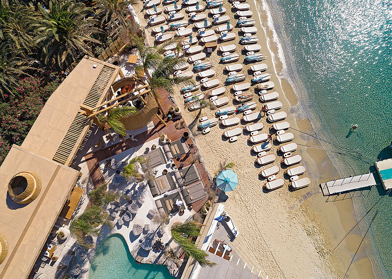 Getestet Der längste Strand der Insel, der Elia Beach, ist fest in der Hand der Myconian Collection.