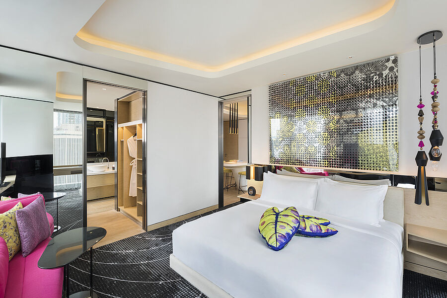 Die knallige Vielfarbigkeit der öffentlichen Bereiche setzt sich in den Zimmern fort, allerdings vor weißen Wänden und auf hellem Holzfußboden. Das High-Tech-Equipment in meiner geräumigen Suite erscheint mir rätselhaft. Die drei Fernseher gehen beim Betreten automatisch an, ausschalten lassen sich jedoch nur zwei. Ähnlich ergeht es mir mit den diversen Lampen. Tippe ich leicht aufs entsprechende Panel, gehen Nachttischleuchten sowie Garderoben- und Badezimmerlicht gleichzeitig an oder aus. Das nervt, wenn man sich ins Bett fallen, und noch ein bisschen lesen will. Meine 520 m2 große EWOW-Suite hat dank hoher Decken Loftcharakter. Hingucker ist der fünfeckige Esstresen mitten im Raum, dahinter eine Anrichte, ideal, wenn man entertainen möchte. Und natürlich der private 10-Meter-Pool mit luftiger Aussicht auf die Stadt. So jung und stylish verspielt das W auch