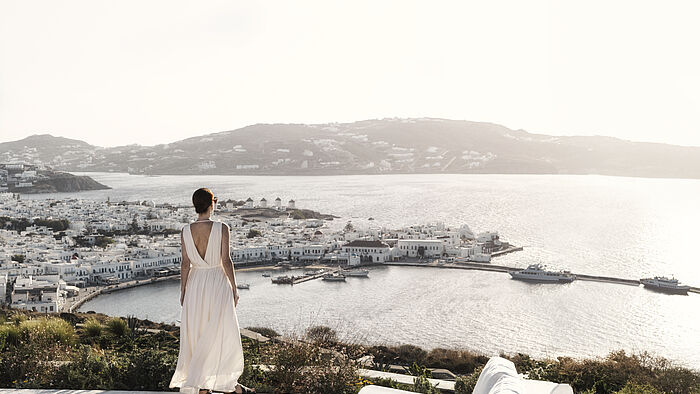 Auf einer Anhöhe über der Stadt Mykonos liegt ein beinahe magischer Ort, das Deos. Mit dem Hotel hat das mykonische Familienunternehmen seiner Gruppe von 14 herausragenden Luxushotels, „The Myconian Collection Hotels & Resorts“, ein weiteres Juwel hinzugefügt. Im Deos sind das Innen und Außen in einem harmonischen Fluss. Verantwortlich dafür zeichnet das renommierte Architektur- und Designbüro GM Architects. Die Architektur folgt der traditionellen kykladischen Linie der Landschaft und spiegelt so die Identität des Ortes wider. Malerische Öffnungen rahmen die spektakulären Ausblicke ein, rustikale Wände aus Felsen und eine großzügige Bepflanzung stellen eine stimmungsvolle Verbindung zur Natur her. Die Innenräume versprühen mit ihren natürlichen Texturen und der maßgeschneiderten Ausstattung einen luxuriösen Minimalismus. Die großzügigen Marmorbäder sind diskret von den Wohnbereichen abgeschirmt, die sich auf große Terrassen mit Pool oder Jacuzzi öffnen. Unübertroffen ist der Panoramablick auf die berühmten Windmühlen, den alten Hafen und über die Nachbarinseln Delos, Syros und Tinos. Die Wellnessbereiche warten mit Fitnessstudio und Spa samt Innenpool und Entspannungsbereich sowie Sauna und Dampfbad auf. Im Deos kehrt auch die renommierte Gastronomie der Myconian Collection zu ihren Wurzeln zurück. Die beiden Chefs Ilias Maslaris und Kristalia Vousmaki bringen im Epico Restaurant ihre hohe Kunstfertigkeit ein und damit das Beste aus den griechischen kulinarischen Traditionen auf den Teller.