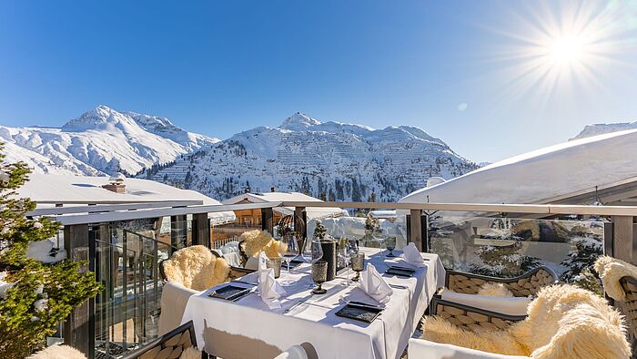 Vom Hotel Bergkristall im sonnigen Oberlech schaut man entspannt auf die umliegenden Berge – und verbringt einen sportlichen Winterurlaub der Extraklasse.