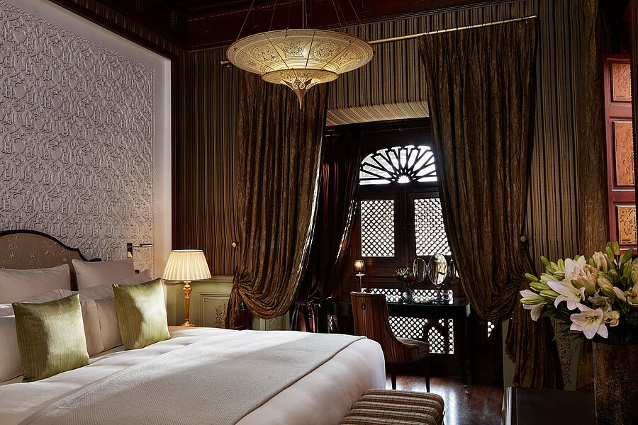 Am Ende einer majestätischen, von Palmen gesäumten Auffahrt öffnen sich die monumentalen Tore. Farbenfrohe Mosaike, Zedernholzdecken und kunstvolle Möbel verleihen ein Ambiente, das an orientalische Märchen erinnert. Weitab des Gewöhnlichen bietet das Haus ein völlig neu gedachtes Konzept für ein Luxushotel. Die Gäste erwartet ein zauberhafter, sechs Hektar großer Besitz, der sich an die Stadtmauern der Altstadt schmiegt. Im Inneren entfaltet sich die Anmut einer privaten Medina mit Gärten, Brunnen und 53 exklusive Riads auf drei Ebenen. Auf dem Dach thront eine prächtige Terrasse mit einem glasklaren Pool. Die weitläufigen Gartenanlagen wurden vom spanischen Landschaftsarchitekten Luis Vallejo gestaltet. Rosen, Hibiskus und jahrhundertealte Palmen laden zum Spaziergang ein.