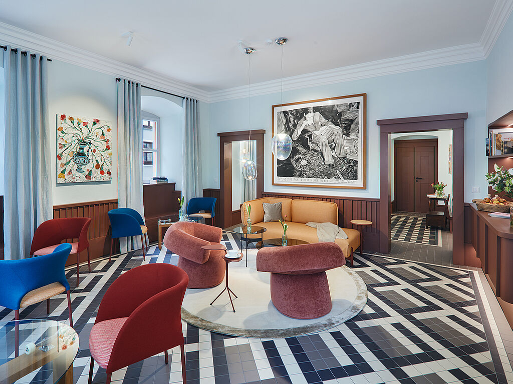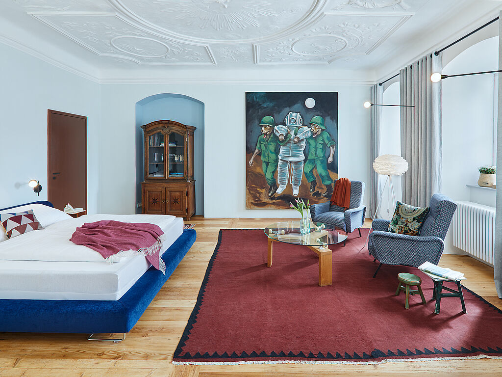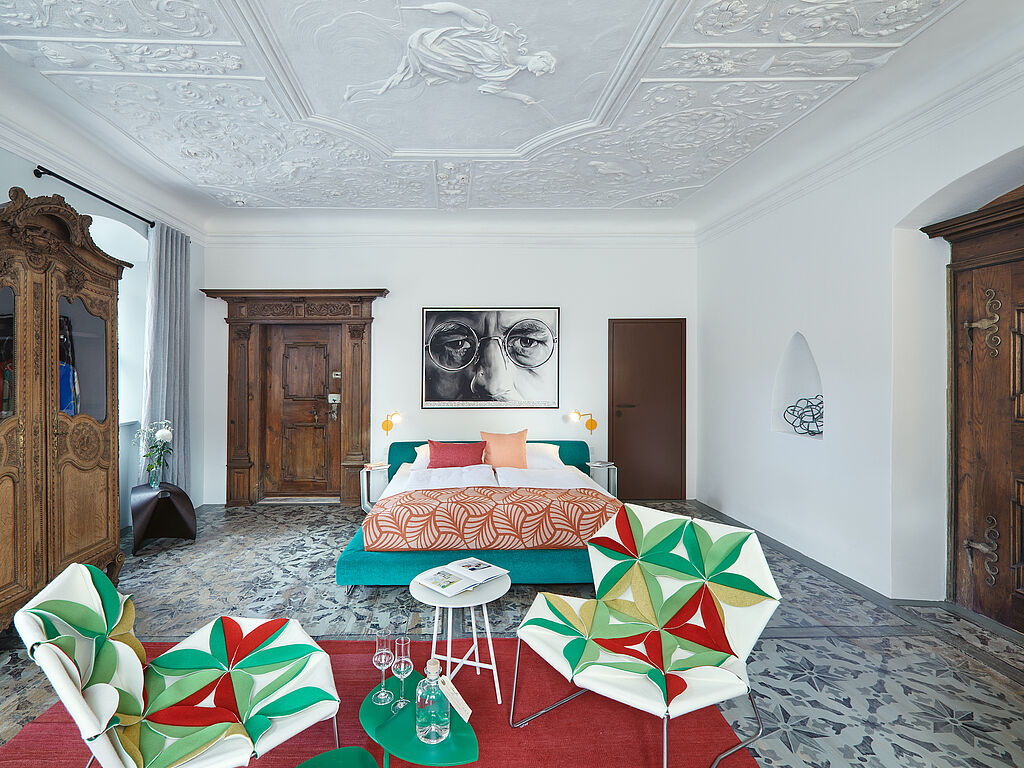 Seit Jahrzehnten befanden sich zwei denkmalgeschützte Bauwerke von 1686 im Dornröschenschlaf. Bis Stephanie und Michael Zink beschlossen, sie mit zwei weiteren zeitgenössischen Gebäuden zu einem Ensemble zusammenzufassen und damit einen lebendigen Treffpunkt für Gäste und Einheimische gleichermaßen erschufen. Verbindendes Element der Gebäude ist der malerische Innenhof mit einem üppig bepflanzten Wintergarten, ausgestattet mit moderner Kunst und Skulpturen. Zwölf stilvolle Apartments und drei gemütliche Doppelzimmer – davon verfügen zwölf Einheiten über eine voll ausgestattete Küche – sind individuell gestaltet und liebevoll mit schönen Details eingerichtet.. Original Stuckdecken, historische Türen, Rosenspitzböden sowie Designmöbelklassiker und Antiquitäten machen sie zu Räumen voller Inspiration.