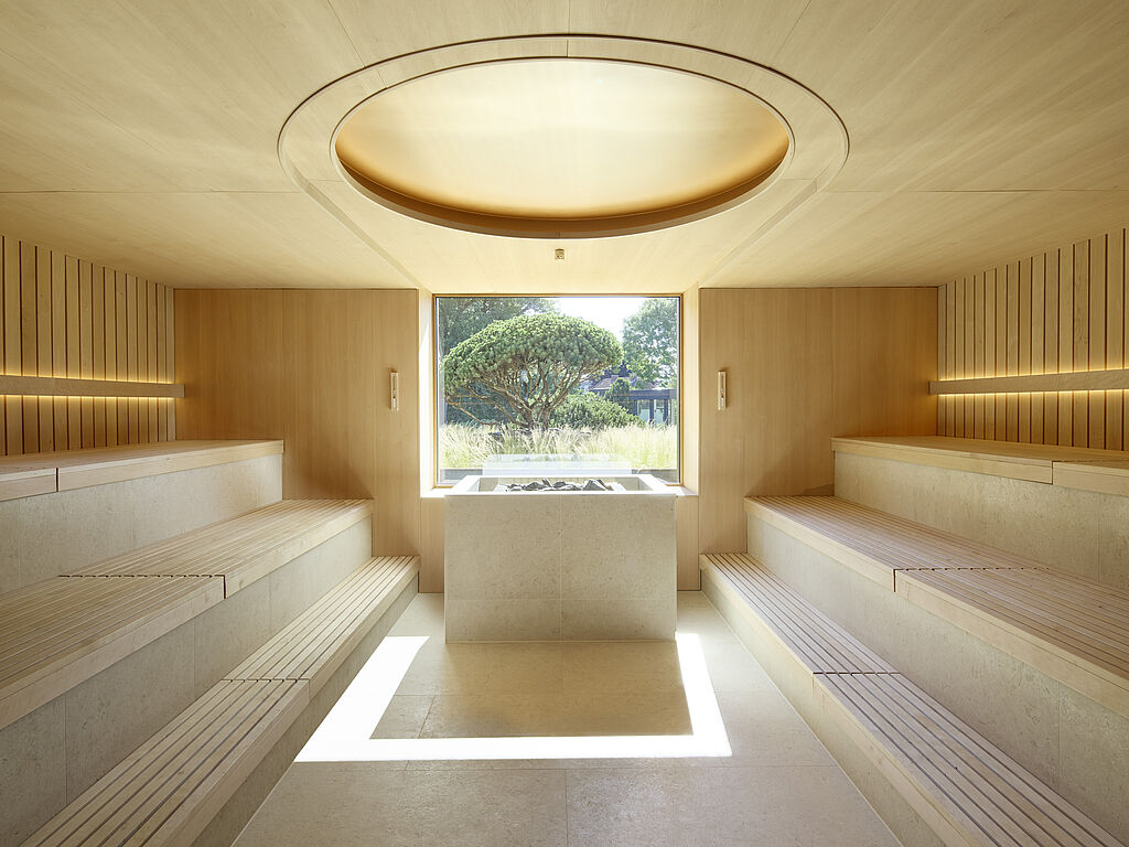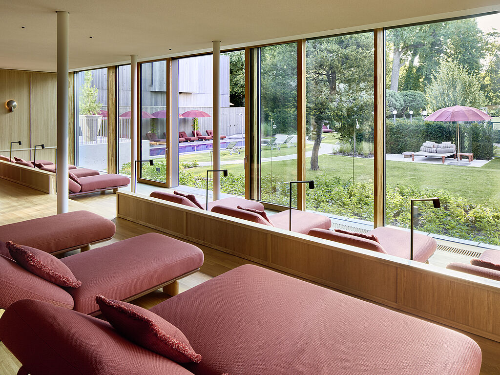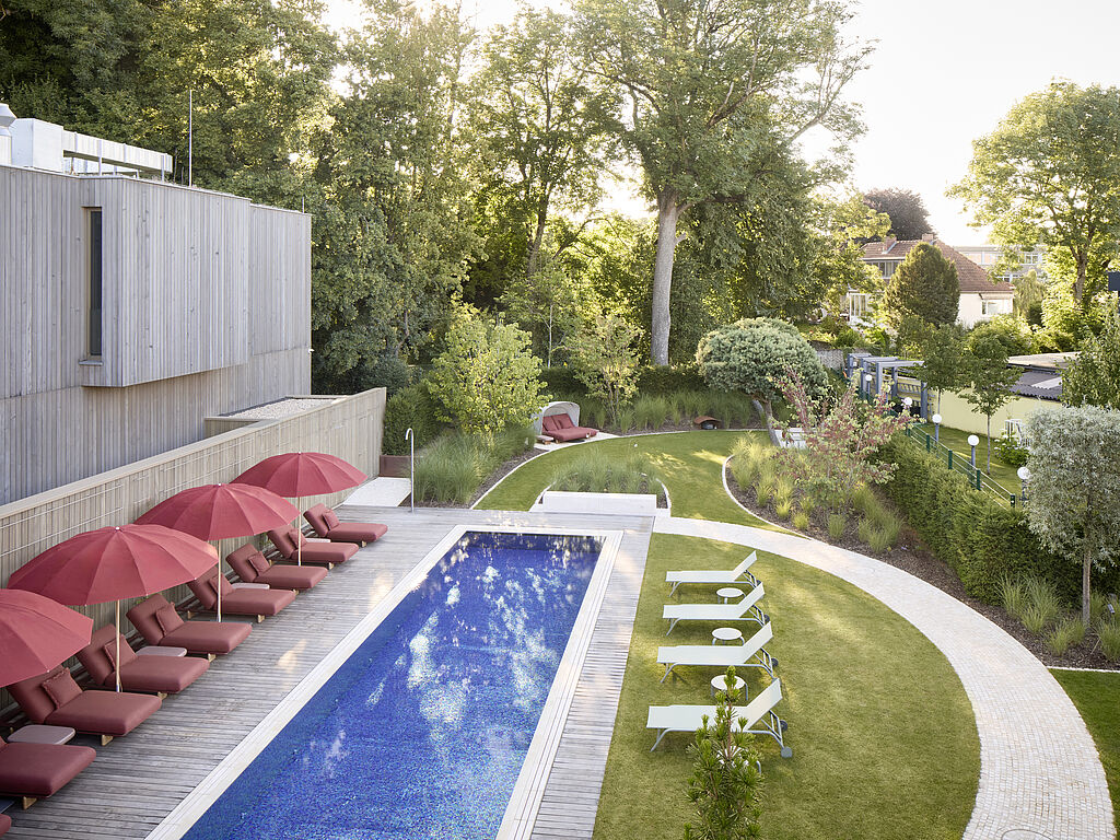 Über einen kurzen Weg durchs Freie, von der historischen Villa und dem modernen Anbau des Hotels aus erreichbar, offenbart sich ein Refugium mit mediterraner Leichtigkeit in einem aufwendig entkernten Bestandsgebäude. Ein beheizter Outdoor-Pool bildet das Herzstück des Spa-Gartens, umgeben von Holzdecks, schattenspendenden Bäumen und großzügigen Liegeflächen. Drinnen erwarten Gäste eine finnische Sauna, Bio-Sauna und Dampfbad mit Eisbrunnen. Wohlfühlzonen und ein Ruheraum mit Kamin sowie komplett verglaster Fassade schenken zudem viel Platz für erholsame Momente. Die Fensterfront lässt sich zum Garten hin öffnen, ein Lounge-Bereich und eine Dachterrasse runden das Gesamterlebnis ab.