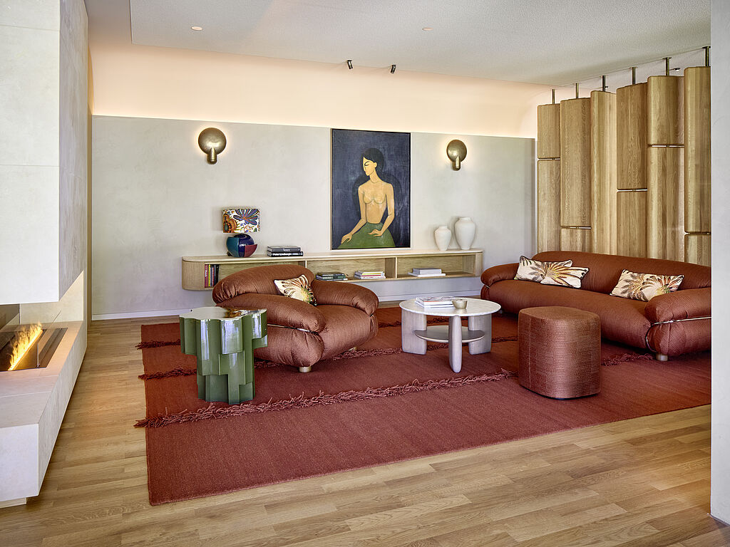 Verantwortlich für das Interior Design sind Christina Beaumont und Achim Gergen. Die Handschrift der Architekten ist überall spürbar; Naturmaterialien wie Travertin und geölte Eichendielen, kombiniert mit feinem Naturkalkputz, edlen Sandtönen und warmen Bronzeakzenten, prägen die klare, elegante Formensprache.