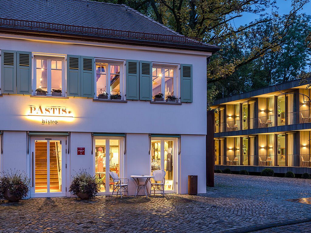 Zum Augenschmaus gesellt sich im PASTIS bistro der Festschmaus auf den Tellern: Unter einem Himmel voller Töpfe, die sich als Leuchten im offenen Dachstuhl entpuppen, wird kreativ frankophil gekocht und leger gegessen. Das kokette Gesamtkunstwerk wurde mit dem Bib Gourmand im Guide MICHELIN ausgezeichnet. Der gläserne Wintergarten rückt die Gäste ins Grüne und bietet nicht nur bei Öffnung der Glasflügel ein Naturschauspiel. Ein Stockwerk tiefer, im Erdgeschoss, ist PASTIS feinkost eingezogen: ein kleiner Shop mit großen Versuchungen. Hier gibt es Köstlichkeiten aus der Hotelküche in bester Manufaktur-Manier. Wein, Chutney und Confit werden von Küchenchef Sebastian Sandor in die Regale gefüllt. In den Themensuiten werden Gaumenfreuden wohnlich interpretiert. „Suite Chocolat“- oder „Suite Ratatouille“ sind gespickt mit gestalterischen und farblichen Anspielungen.