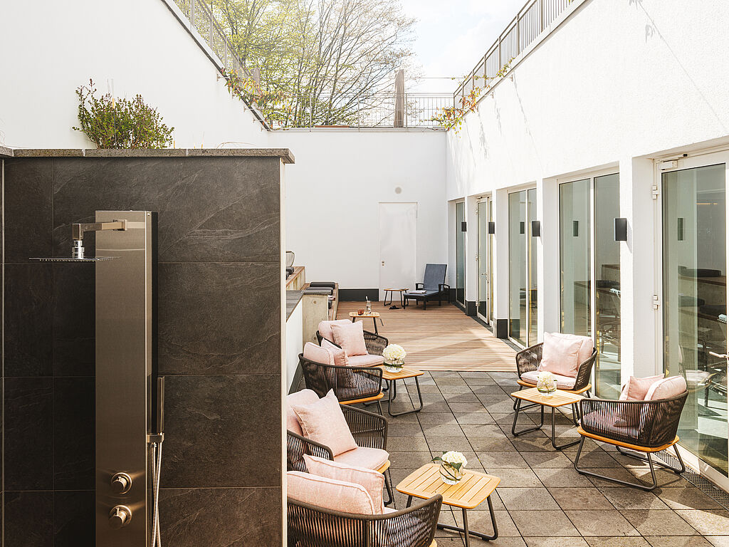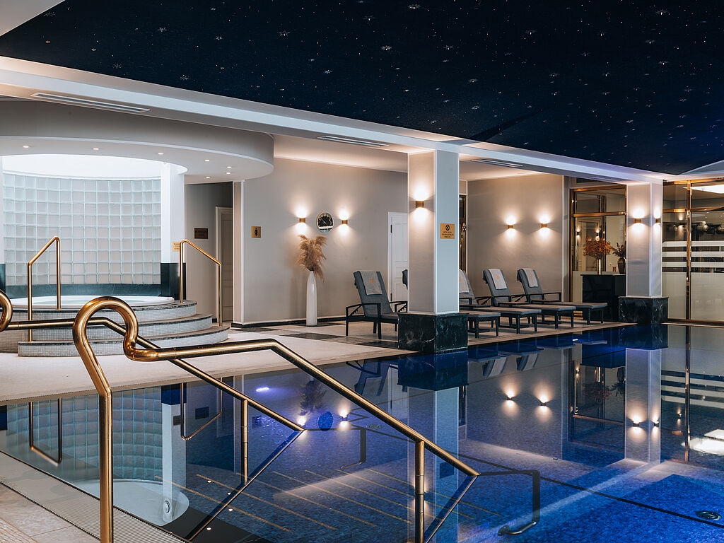 Das Interior Design ist elegant und zugleich voller moderner Kontraste. Exklusive Wellnessmomente in stilvollem Ambiente bietet der 1.000-Quadratmeter 4 elements spa by Althoff mit Indoor-Pool, moderner Saunalandschaft und verschiedenen Ruheräumen und vielfältigen Treatments, inspiriert von den vier Elementen Feuer, Wasser, Luft und Erde. Ein besonderes Highlight ist der Außenbereich mit Freiluftdusche, großzügiger Liegewiese und einmaligem Schlosspanorama. Seit Herbst 2024 stellt die Kooperation mit dem INSTITUT UNIQ ein neues und innovatives Angebot dar, das luxuriöse Erholung mit medizinischer Expertise vereint.