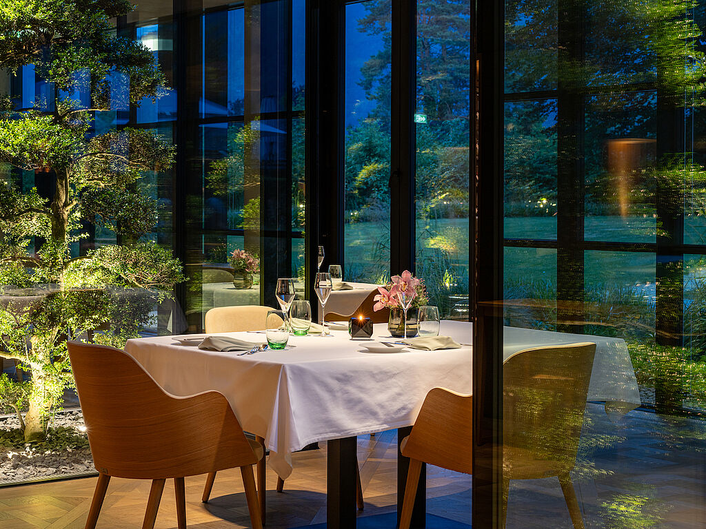 Das scheinbar Alltägliche sorgt für Überraschungen – das ist das Credo von Sternekoch Thomas Kellermann im Parkhotel Egerner Höfe. Der gebürtige Oberbayer bezeichnet sich selbst als modernen Traditionalisten und zelebriert mit seinem Team regional inspirierte Küche auf Spitzenniveau. Im Mittelpunkt stehen für ihn dabei traditionelle, oftmals herkömmliche Lebensmittel von bester Qualität, die aus der Umgebung stammen. Modern interpretiert, mit klaren Aromen und Texturen setzt er sie gekonnt in Szene und sorgt so für einen Wow-Effekt auf dem Teller. Den perfekten Rahmen für Thomas Kellermanns Kreationen bietet das neue Gourmetrestaurant Dichter im Parkhotel Egerner Höfe, ausgezeichnet mit zwei Michelin-Sternen. Große Fensterfronten geben hier den Blick auf die umliegenden Berge des Tegernseer Tals frei. Raumhohe Glaskuben, indirekt beleuchtet und mit heimischen Bäumen bepflanzt, unterstreichen ebenfalls die enge Verbindung zur umliegenden Natur und stehen in Einklang mit Thomas Kellermanns regional inspirierten Kompositionen.
