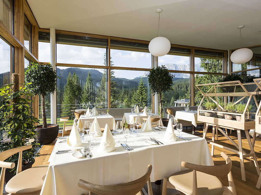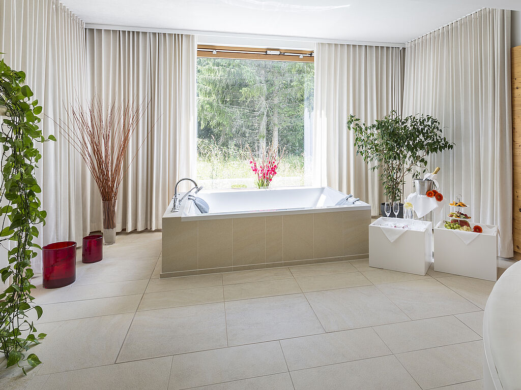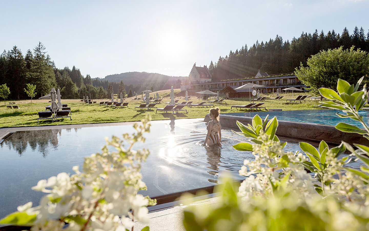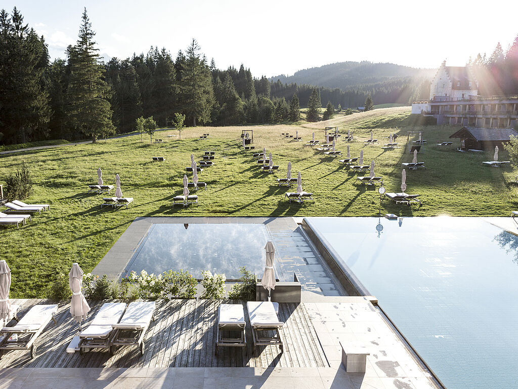 Im Badehaus kommen Wellnessfans voll auf ihre Kosten. Insgesamt fünf Innen- und Außenpools laden zum Schwimmen ein, in acht Saunen und Dampfbädern wird geschwitzt, große Liegewiesen und geschützte Terrassen verleiten zu einem Nickerchen. Besonders schön döst es sich im Winter auch in den Ruheräumen mit Kaminfeuer. Im Meditation House by Kengo Kuma können die Gäste mitten im Wald Yoga praktizieren und meditieren. Frische Luft schnappen Aktive beim Laufen, Wandern oder Nordic Walking über Wiesen und durch Wälder sowie beim Aqua Fit und Qi Gong.