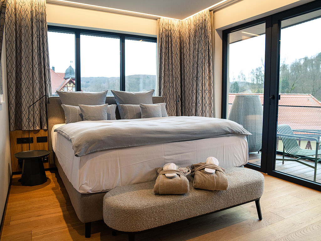 Umgeben von den sanften Hügeln des Südharzes über den Dächern von Stolberg liegt ein feines Hideaway, das unvergessliche Erlebnisse inmitten der Natur verspricht. Das Hotel & Spa Suiten FreiWerk hoch oben auf der Thyrahöhe ist der perfekte Ort, für eine Auszeit ohne Hast und Sorgen.