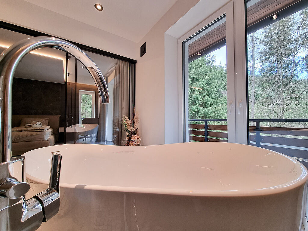 Ein Highlight sind die freistehenden Badzuber (Jacuzzis) unter freiem Sternenhimmel und Blick auf 40 Meter hohe Fichten