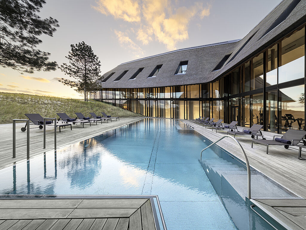 Dabei ist die achtsame Einbindung der Architektur in die umgebende Dünenlandschaft ein zentrales Anliegen des neuen Medical Health Resorts. So verfügt der Lanserhof Sylt über das größte Reetdach Europas: Ganze 12.900 Quadratmeter beträgt die Gesamtfläche des einzigartigen Dachs, das die Lanserhof Philosophie durch die naturbezogene Gestaltung bereits von außen perfekt widerspiegelt. Auch im Herzen des Hauses stellen naturbelassene, ausgewählte Materialien, harmonische und schlichte Räume, elegante Formen, dezente Farben und eine leichte und offene Gebäudearchitektur mit stetigem Blick auf das Meer oder die Dünen die ganzheitliche Erholung der Gäste in den Mittelpunkt. In den großzügigen, modernen Stil des Resorts passen sich auch die 55 Zimmer und Suiten ein. Die in das Reetdach integrierten Balkone sind die ersten ihrer Art und ermöglichen einen Rundumblick bei maximaler Privatsphäre. Auf einer Grundfläche von 20.000 Quadratmetern befinden sich zudem modernste Behandlungs-, Beratungs- und Bewegungsräume, ein innovativer Fitnessbereich, Saunen, Dampfbäder sowie ein Indoor- und Outdoor-Salzwasserpool mit Gegenstromanlage. Von dort aus genießen die Gäste einen atemberaubenden Blick auf das ruhige Wattenmeer.