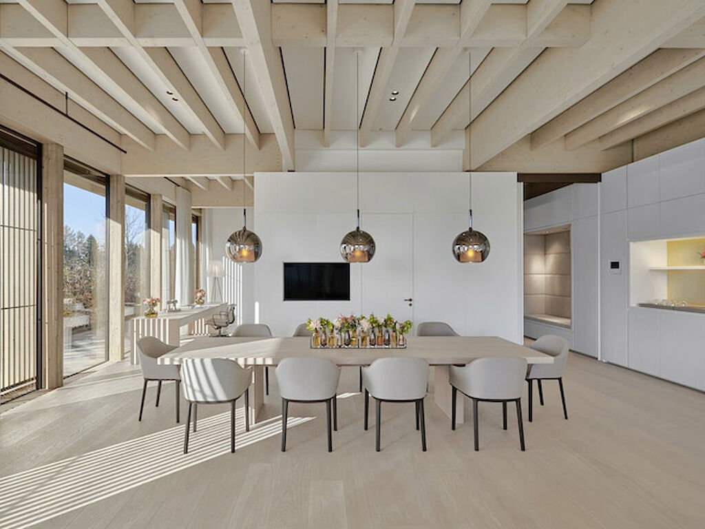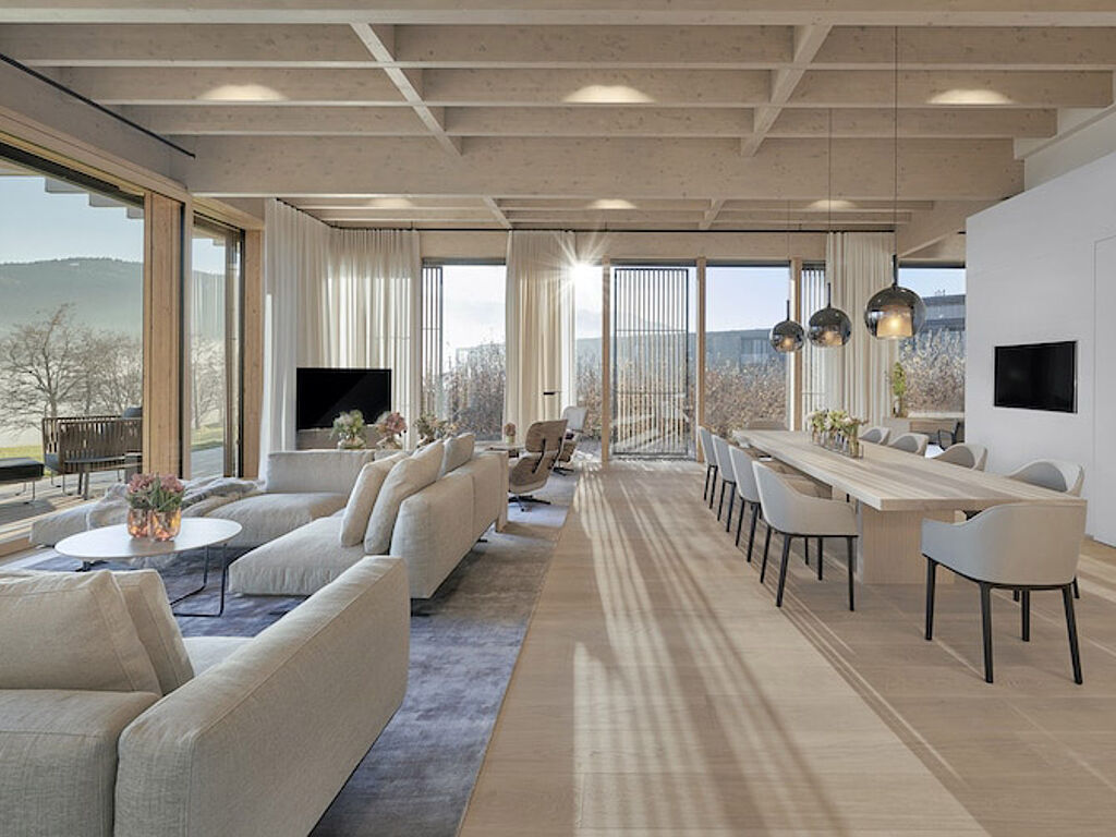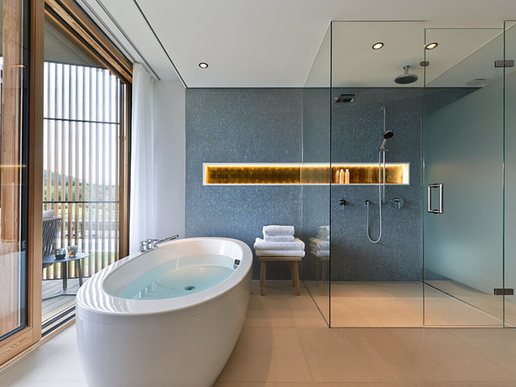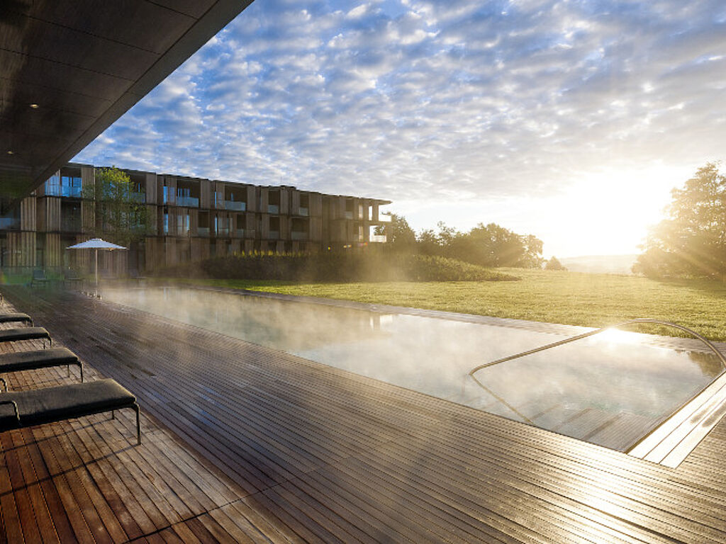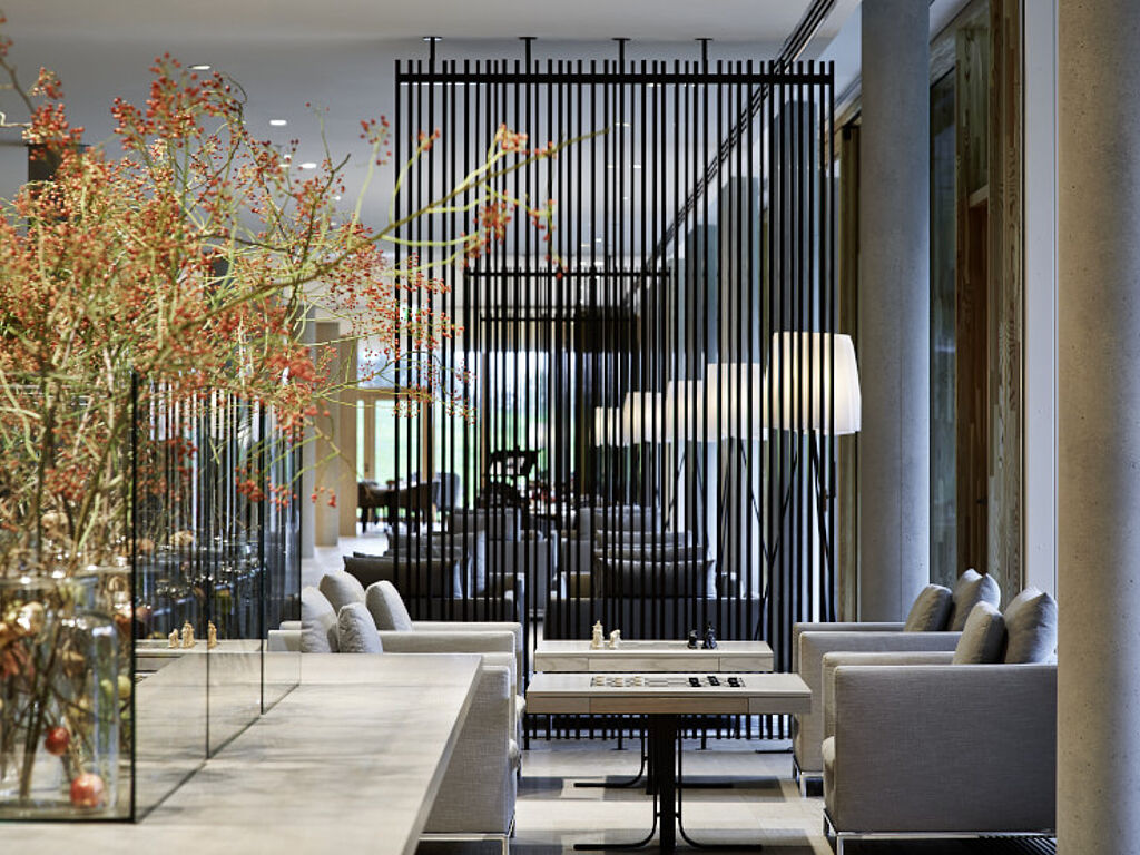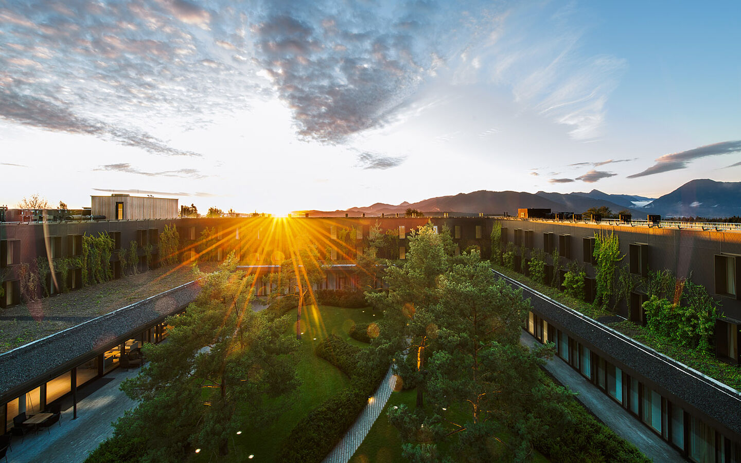 Erlesene Materialien wie Holz, Leder oder Naturstein schaffen eine edle Umgebung, in der die Natur mit allen Sinnen erlebbar wird. Durch die großen Fensterfronten werden die sorgfältig inszenierten Innenräume mit Sonnenlicht und Wärme geflutet. Um den Gästen größtmöglichen Komfort zu bieten, wurden bei der Gestaltung der Zimmer und Suiten zudem neueste gesundheitliche und naturwissenschaftliche Erkenntnisse berücksichtigt: So besteht etwa in jedem Raum die Möglichkeit einer individuellen Stromabschaltung – zur Vermeidung von Elektrosmog und für einen gesunden Schlaf.
