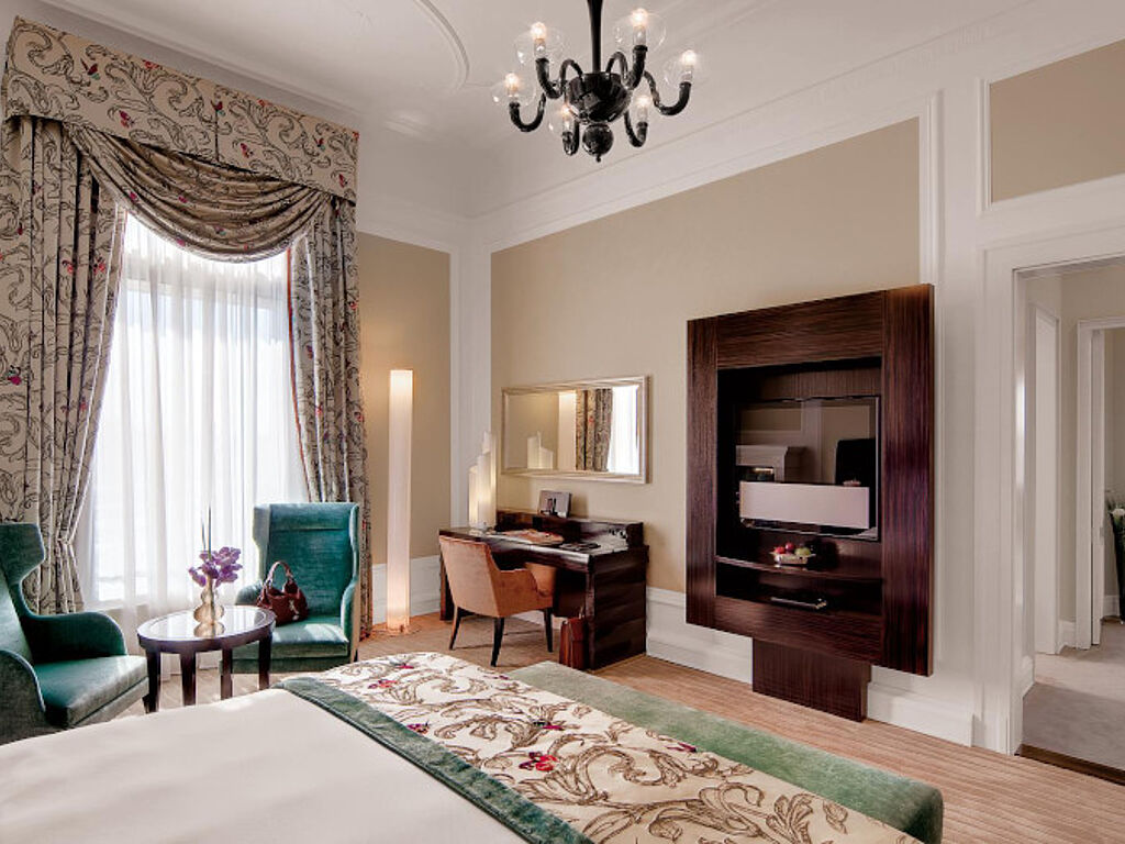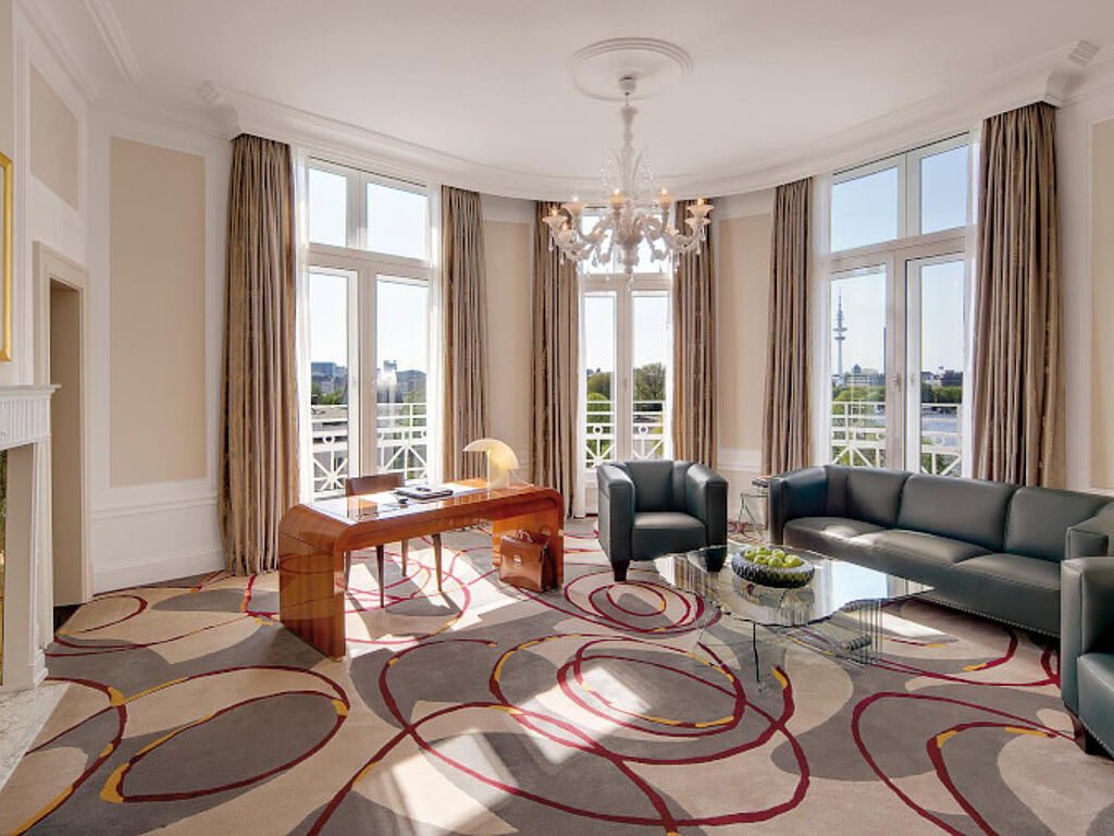Die Zimmer und Suiten vereinen die Klassik des Grandhotels mit maritimen Anklängen und zeitgenössischem Design. Mit ihren hohen Decken, bodentiefen Fenstern und dem eleganten Interieur sind sie Rückzugsräume zum Wohlfühlen und Erholen. Diese komfortablen Wohnwelten sind mit edlen Teppichen, feinen Seidenstoffen sowie hochwertigen Materialien wie Makassar Ebenholz und Carrara Marmor eingerichtet und mit eigens für sie geschaffenen modernen Kunstwerken stilvoll-harmonisch dekoriert.