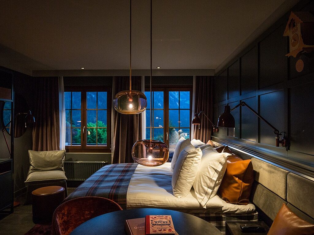 Der Kontakt mit der Natur ist allgegenwärtig, nicht nur, wenn man aus dem Fenster auf die Schweizer Alpen blickt. Im ganzen Haus dominieren dunkle, erdige Farben, die aber keinesfalls erdrückend wirken, sondern gemütlich, kuschelig und heimelig. Ein wenig erinnert das Ambiente bisweilen an einen englischen Club. Die Chalet-Romantik wird in den Zimmern und Suiten noch potenziert: natürliche Stoffe, Boxspringbetten und extra für das Hotel designtes Inventar verwöhnen das Auge und wiegen Sie in einen erholsamen Schlaf. Dafür sorgt auch der traumhafte Ausblick auf die Landschaft: Die Berner Alpen stehen als Wächter der Entspannung in unmittelbarer Reichweite.