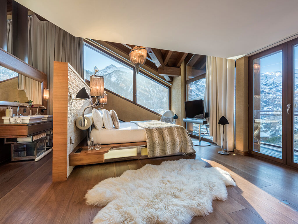 Das Chalet verfügt über 5 außergewöhnliche Suiten, die alle mit Doppelbetten, eigenen Ankleide-Bereichen und viel (alpinem) Komfort ausgestattet sind: Felldecken und -teppiche, spektakuläre Ausblicke über Zermatt, deckenhohe Fensterfronten, Pflegeprodukte von ESPA®, Regenduschen und in der Master Suite sogar mit privatem Jacuzzi. Gebettet auf edelsten Materialien darf man hier bei Surround Sound entspannen und Raum und Zeit für einen Moment vergessen.