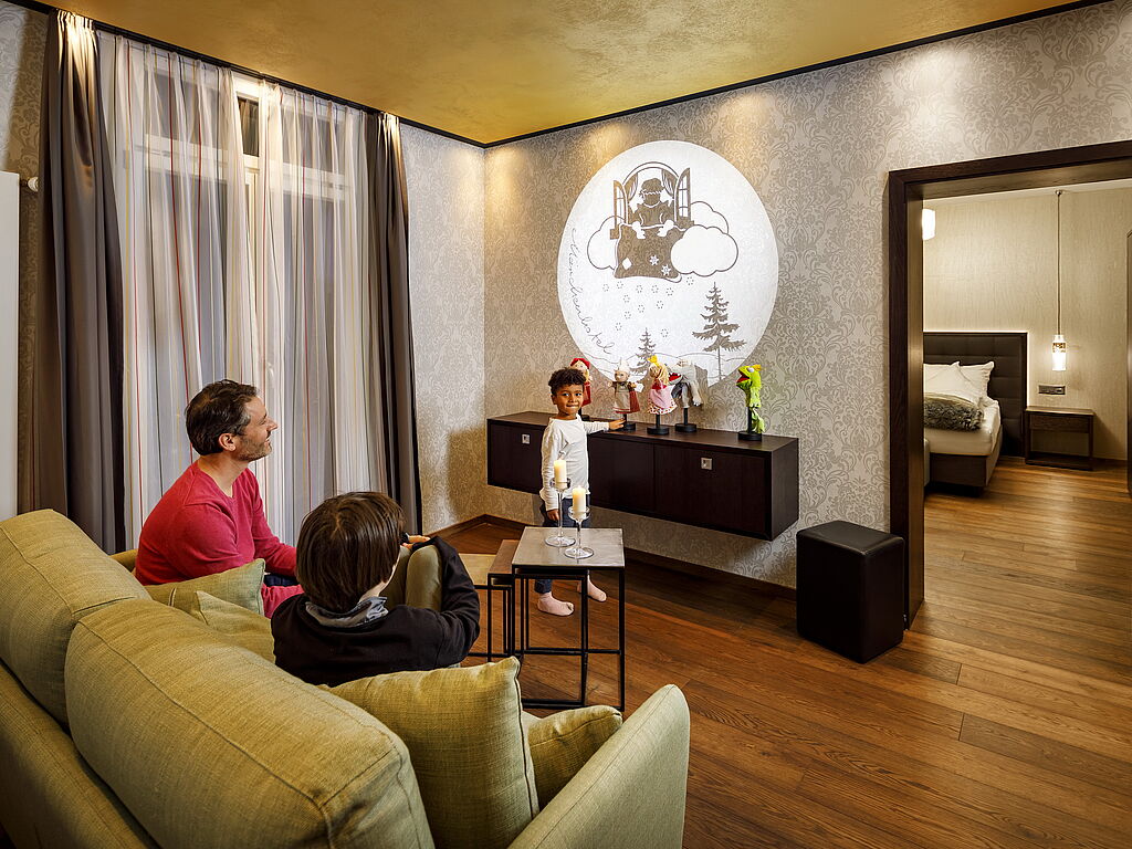 Der erst kürzlich vollständig renovierte Saal für Könige sorgt zudem mit aufregenden Attraktionen wie fliegenden Tischen, der Lokomotive Emma oder der rätselhaften Zauberwand für strahlende Kinderaugen. Abends erzählen eine Märchenfee oder ein Märchenonkel spannende Geschichten. Ein absolutes Highlight des Märchenhotel ist der extravagante, hauseigene Aquariumlift. Die Gäste schweben in diesem originellen Fahrstuhl vorbei an farbigen Fischschwärmen in 5 verschiedenen Aquarien.