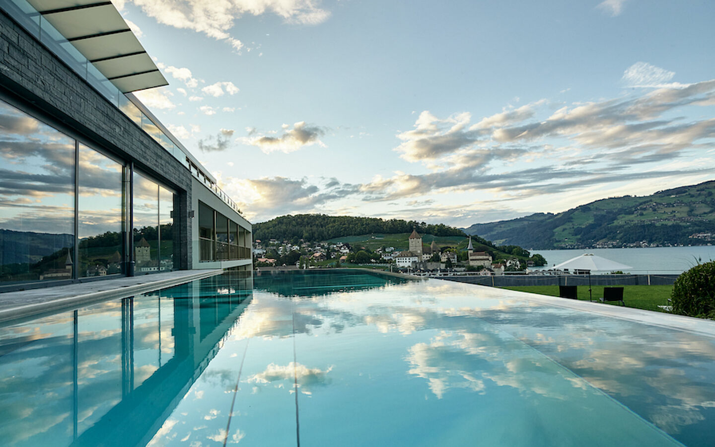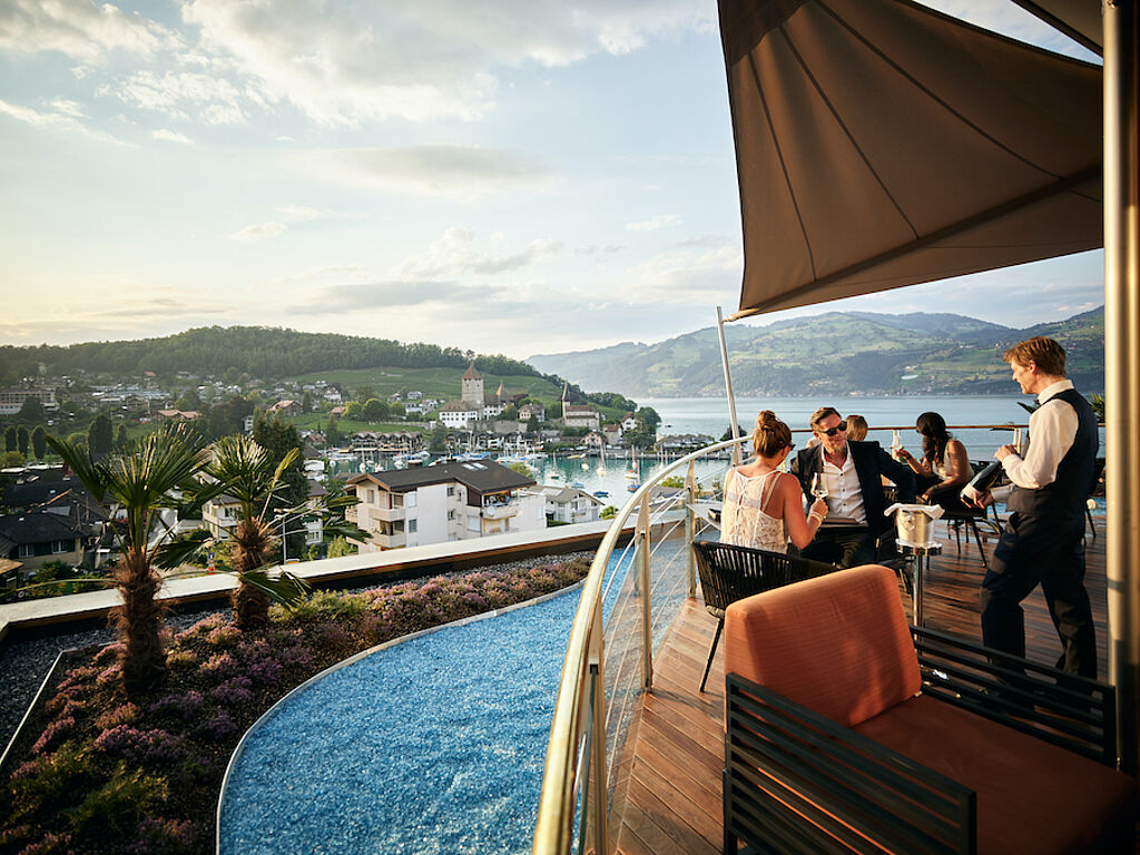 Den lieben langen Tag am privaten Strand liegen und das funkelnde Antlitz des Sees auf sich wirken lassen, oder eine Liege im Hotelpark schnappen und die sattgrüne Vegetation im kühlen Schatten genießen: das Strandhotel verspricht Urlaubs-feeling deluxe. Wer glaubt, das ginge nur im Sommer gut, liegt allerdings falsch. Winters gibt man sich dem Panorama ganz einfach vom 30 Grad warmen Infinity Pool aus hin. Auch das ein Gefühl, das man nicht so schnell vergisst. Ein weiteres Highlight ist neu entstandene Captain’s Bar, von der man einen einzigartigen Ausblick auf die Spiezer Bucht und den Thunersee hat.