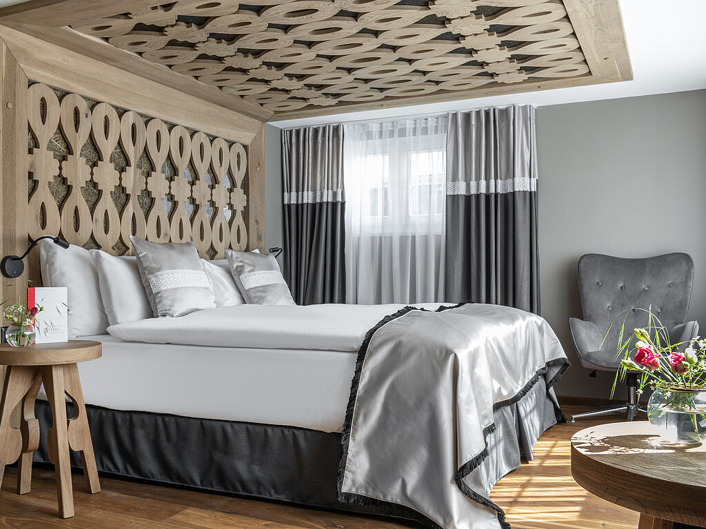 In insgesamt 18 charmanten Zimmern und Suiten übernachten die Gäste in himmlischer Bequemlichkeit: z. B. in Boxspringbetten mit authentischer Heulade am Kopfende. Im ganzen Haus ist Holz das dominierende Designelement, ein Zeichen für die Verbundheit mit der Natur. Die Residenzen mit zwei separaten Schlafzimmern eignen sich ideal für Familien genauso wie der Kinderspielplatz hinter dem Haus