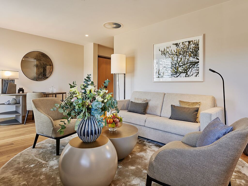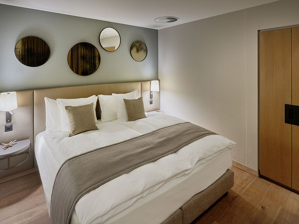 Die 85 Zimmer, vier Junior-Suiten und zwei Panorama-Suiten des Hotel Seepark werden von einer harmonischen Kombination aus dezenten Farben, klaren Linien, elegantem Interieur und natürlichen Materialien bestimmt, die Badezimmer – ausgestattet mit der Pflegelinie «Alpine Herbs by Seepark» – erstrahlen in Weiß- und Brauntönen. Auf den prachtvollen Park oder das Stockhorn ausgerichtet, werden die Räume zu individuellen Entspannungs-Refugien nach einem geschäftigen Tag. Das Highlight sind die beiden Panorama Suiten im obersten Stockwerk: Hier warten nicht nur zwei private Dachterrassen mit Rundumsicht, sondern auch ein Bürobereich mit Schreibtisch und Bibliothek.