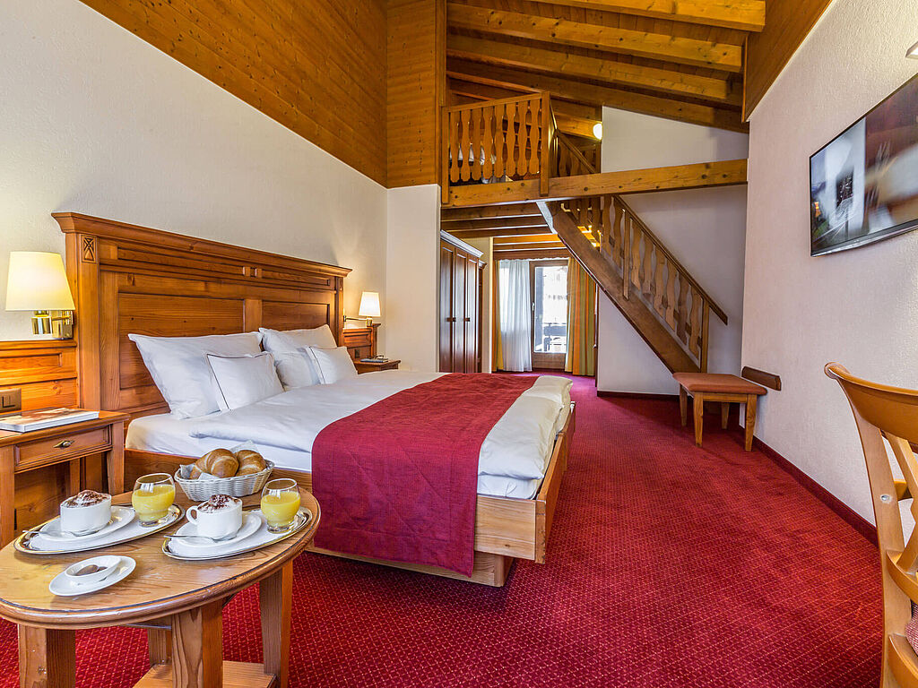 Es ist kaum zu übersehen, dass Gäste hier tatsächlich noch Könige und Königinnen sind. Ob jung oder alt, mit der ganzen Family, als Paar oder in einer Gruppe von Freunden – für alle ist bestens gesorgt und jedem gebührt das Seine. Fest steht, dass alle am roten Teppich(-boden) und in herrlicher Umgebung residieren. Königlich eben! 54 komfortabelste Zimmer und Suiten begeistern mit Südsicht (aufs Matterhorn), Balkon oder Terrasse und viel Zermatter Charme. Highlight? Das neu gestaltete Familienzimmer auf zwei Etagen, mit einem Katamarannetz perfekt zum austoben für kleine Prinzen.