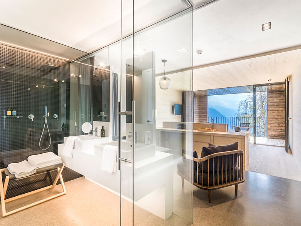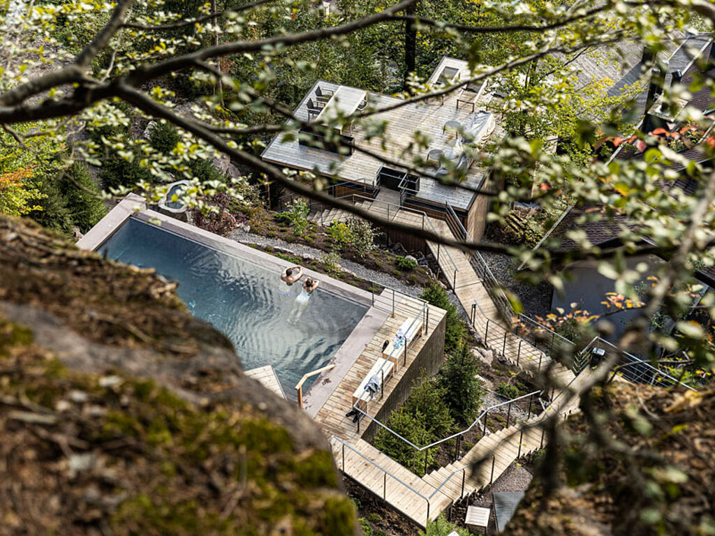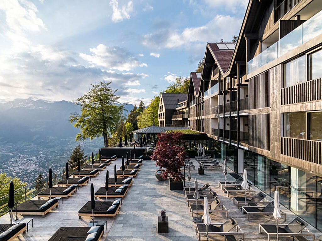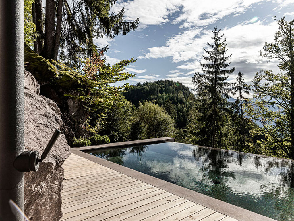 Und schon wieder schwebt man hier: Dann nämlich wenn der Gaste seine Runden im Sole-Infinity-Pool zieht – 16 Meter lang und 8 Meter breit führt der Pool wie durch eine warme Höhle in allen vier Jahreszeiten auf die beeindruckende Landschaft zu –, um dann im Ruhehaus bei offenem Kamin und in der Bibliothek in einer anderen Welt zu schwelgen. Und dann gibt es auch noch den neuen Onsen Pool aus der japanischen Badekultur, Outdoor Whirlpool mit bis zu 38 Grad, Porphyr-Biosauna, Finnische Wald Sauna, Dampfbad, Ruhehaus mit Panoramablick, Sonnenterrasse mit Meranblick, Activity House im Wald mit Gym und Yoga Studio, Spa Abteilung mit Porphyr und Eisenkrautbehandlung. Es wird übrigens eine geführte Forest Therapy/Waldbaden angeboten oder man kann auch selbst die Initiative ergreifen und in den umliegenden Wald entspannt eintauchen.