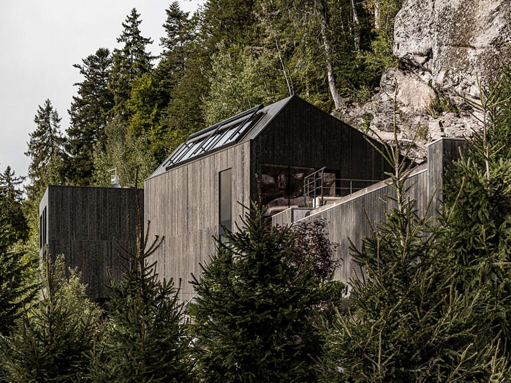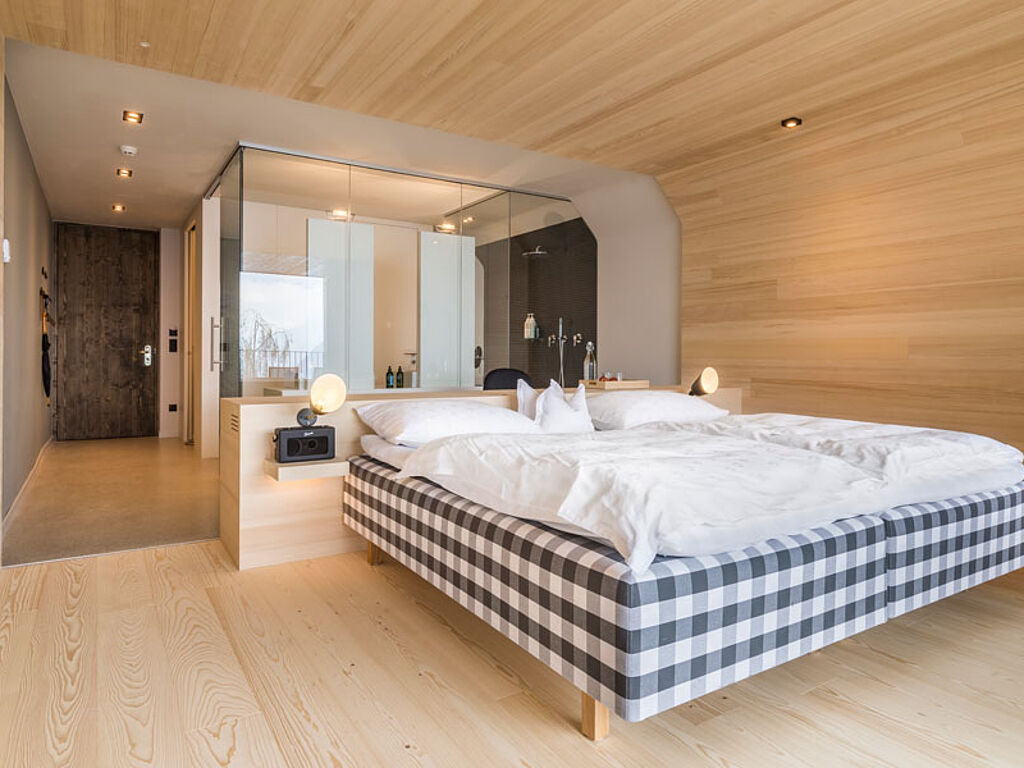 Das Ehepaar Carmen Kruselburger Alber und Klaus Alber haben sich hier in Hafling einen Traum erfüllt: Ein alpines Hideaway, das sofort verzaubert. Man kann nur sagen – Auftrag erfüllt. Das Hotel schmiegt sich an einem steilen Hang in den Wald und bietet von den Balkonen der Suiten sensationelle Ausblicke. Man schwebt förmlich in den Zimmern, insbesondere aber im Infinity Pool. Die Aussattung ist sehr cool und puristisch, mit bodentiefen Panoramafenster lassen Licht, Luft und quasi die Natur in das Innere.