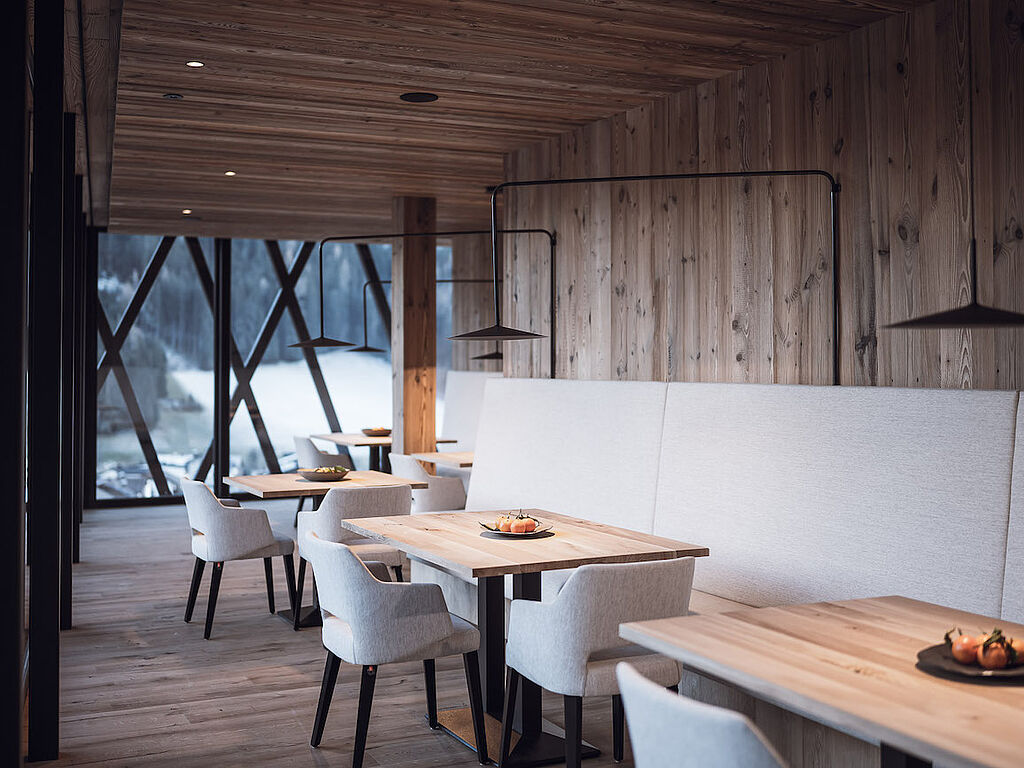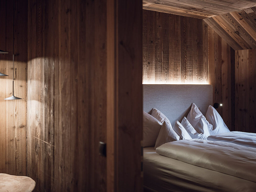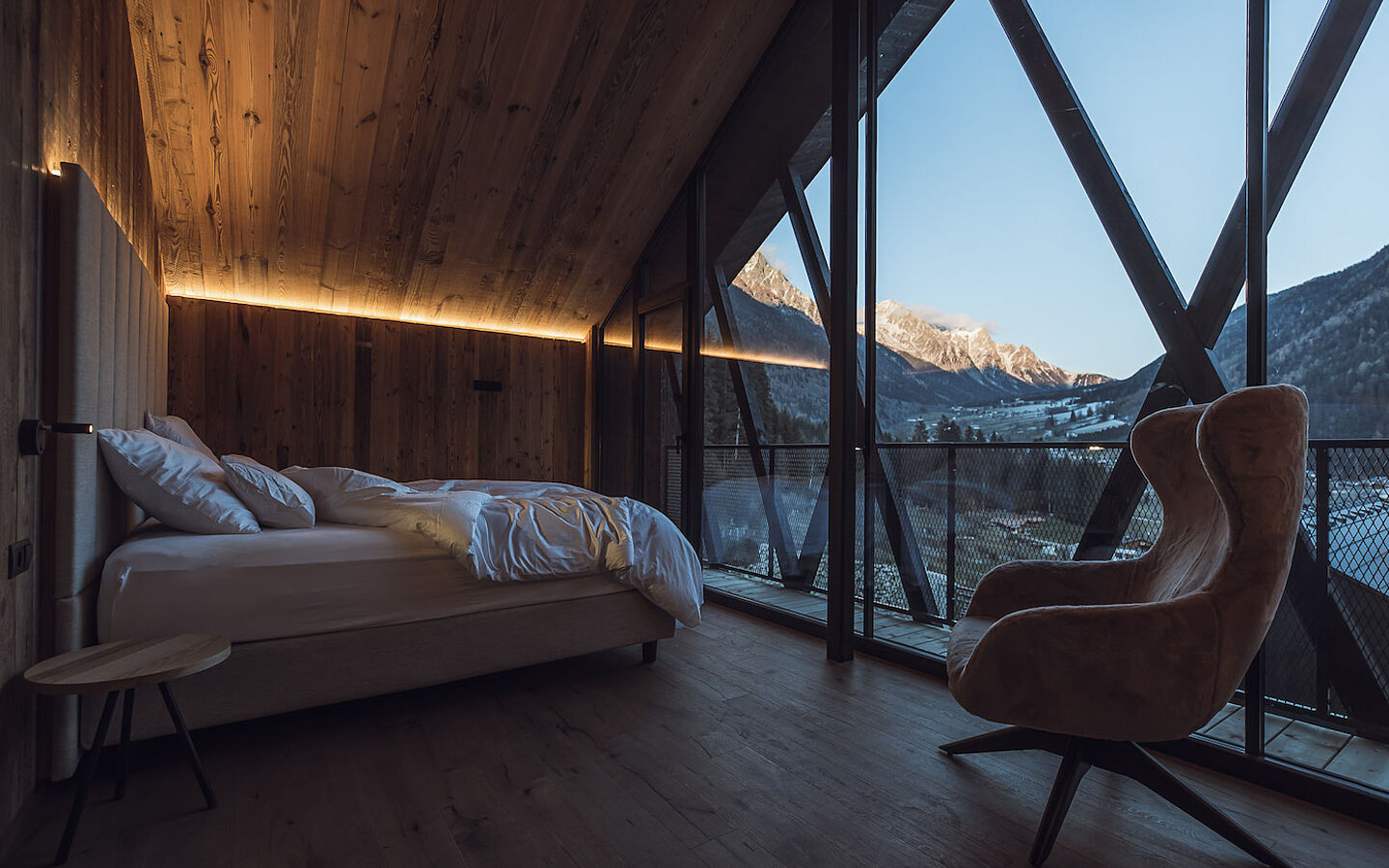 Amus Chalets Dolomites ist bereits in seiner Architektur besonders: Angelehnt an das Konzept des Adlernestes schmiegen sich die Chalets unauffällig in die umliegende Natur ein. Entstanden sind die Chalets am Lieblingsort von Gastgeber Uli: Seit Jahren kommt er an diesen Platz, um seinen eigenen Gedanken nachzugehen und für sich zu sein. Das Herzstück ist das Haupthaus mit Rezeption, Stube, Vinothek und Panoramaterrasse mit einladender Atmosphäre für gesellige Stunden. Wer sich lieber in sein eigenes Reich zurückzieht, kann im privaten Chalet bei knisterndem Feuer in der Kuschelecke entspannen oder auf der privaten Terrasse mit Blick auf die Bergwelt die Seele baumeln lassen.