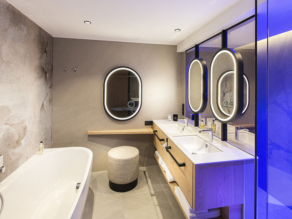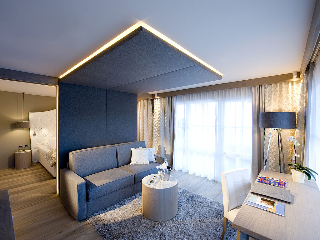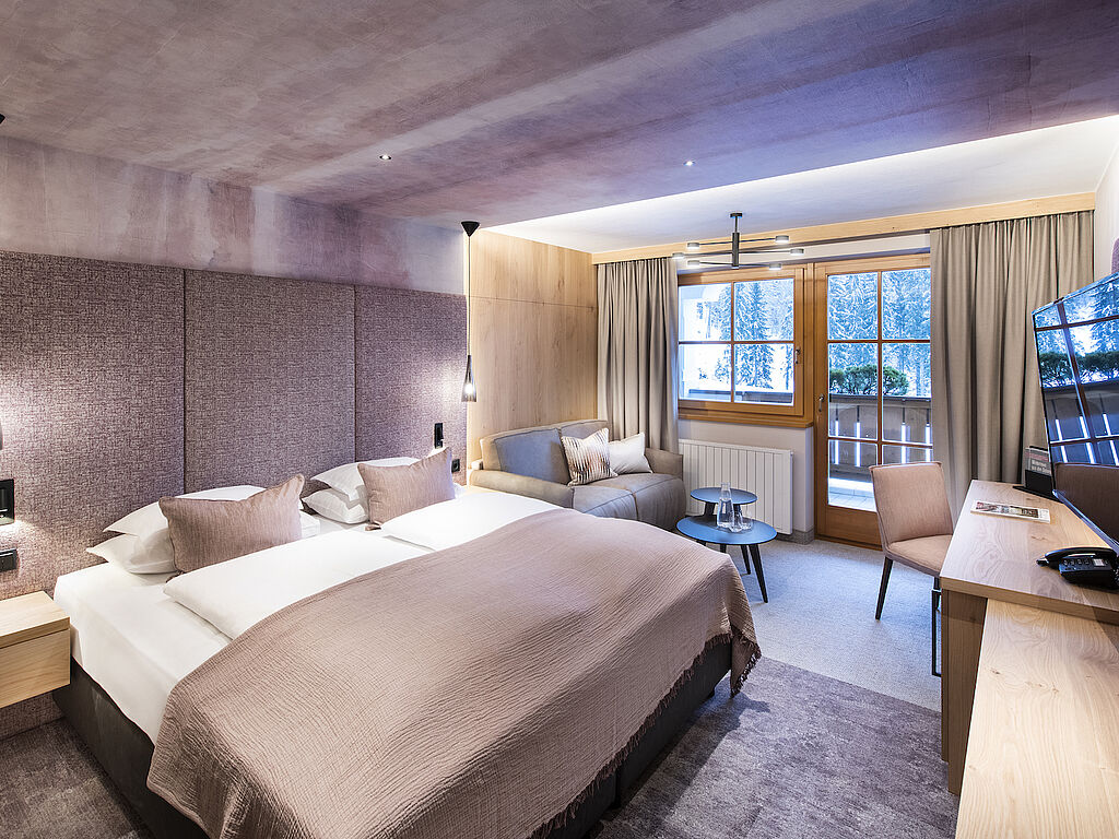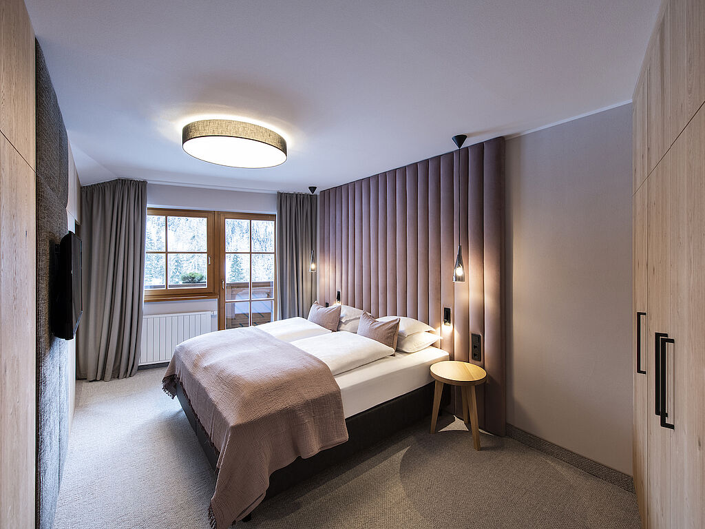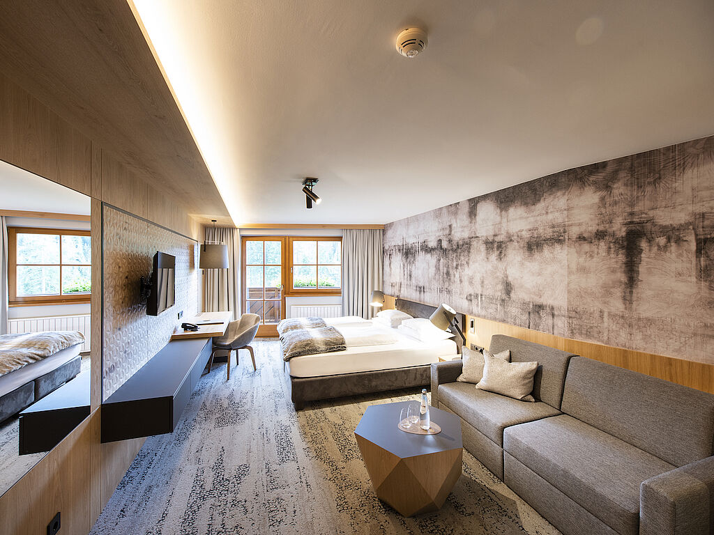 Die Einrichtung der gemütlichen Zimmer und Suiten des 4 Sterne Superior-Hauses sind alpin modern und punkten mit einem atemberaubenden Blick auf die umliegende Bergwelt.