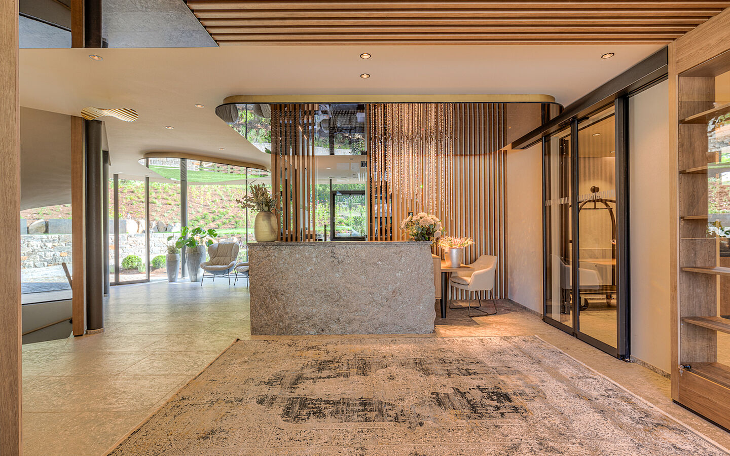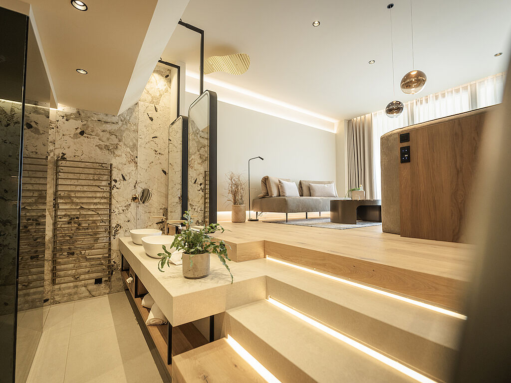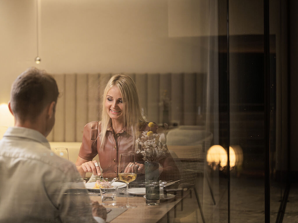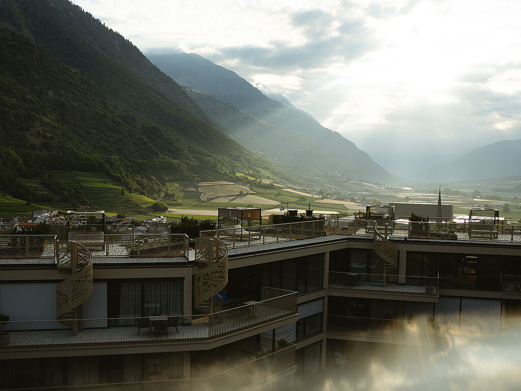 Viel Raum für erholsame Wellness gibt es zudem im großzügiger Spa-Bereich, der mit mehreren Saunen, Behandlungsräumen, Fitnessbereich, Innen- und Außenpool und Rooftop-Terrasse mit Whirlpool aufwartet. „Hier darfst du jetzt und in diesem Moment zur Ruhe kommen“, lautet die Message inmitten wohltuender Düfte und mit herrlicher Aussicht auf den Vinschgau.
